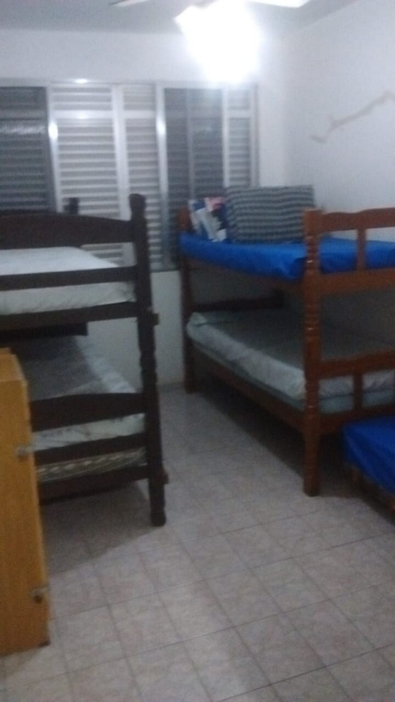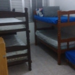 Quarto de solteiro com 4 camas de solteiro (sendo 02 beliches), 01 colchão de solteiro avulso + 1 sofá cama, travesseiros e ventilador de teto.