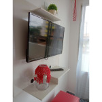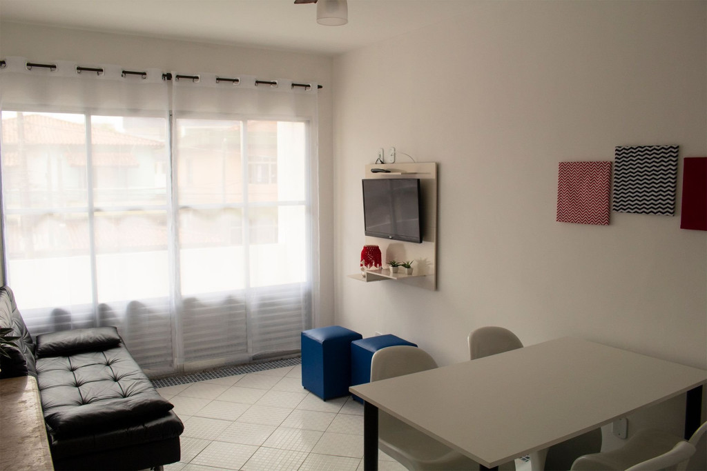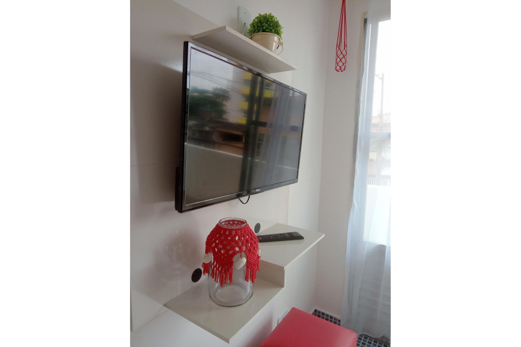 O ap. é bem arejado e iluminado. Tem ventilador de teto na sala, ar condicionado no quarto, Wi-Fi e a TV tem canais abertos, além de vaga na garagem.