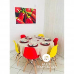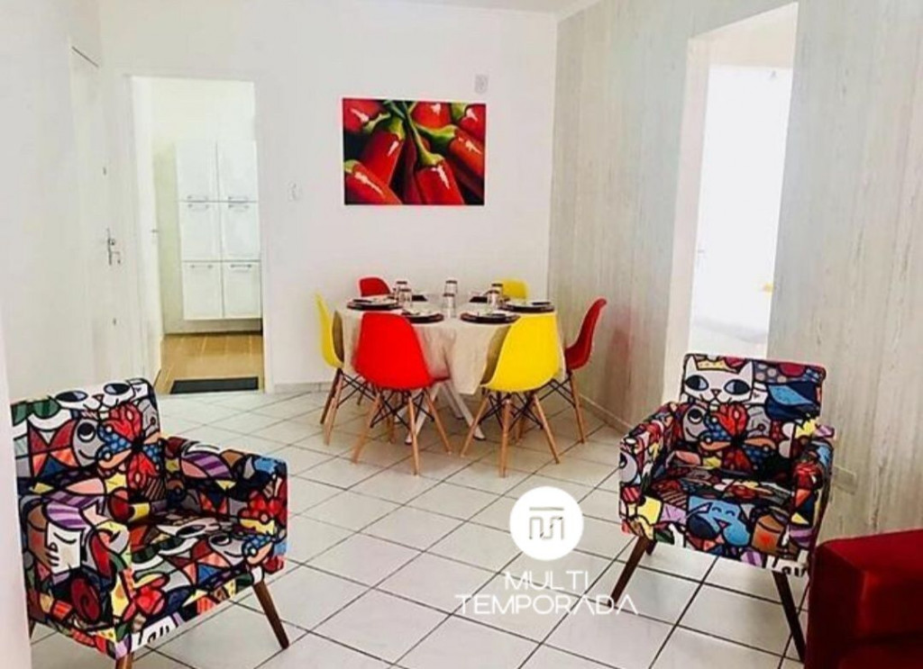 São 103 metros quadrados, sendo dois dormitórios com ar-condicionado e cama de casal, cozinha e sala integrados, sacada e banheiro social. A cozinha é equipada com fogão, forno, geladeira, sanduicheira, cafeteira, liquidificador e todos utensílios necessários para fazer uma boa refeição. A sala é possui ventilador de teto e uma TV Smart 32. Além disso, oferecemos Internet WiFi de qualidade, travesseiros e máquina de lavar.