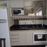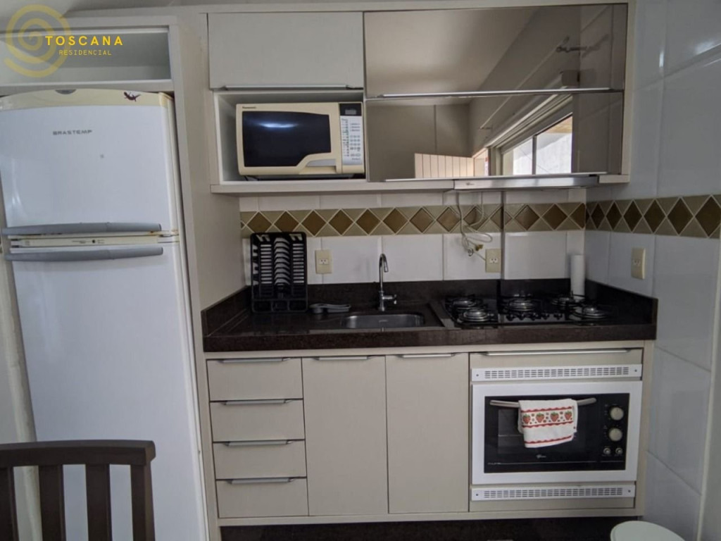 Cozinha equipada com fogão a gás, geladeira, microondas e utensílios básicos.