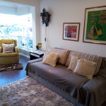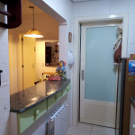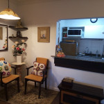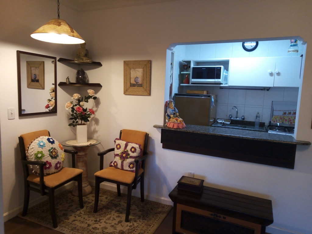 Sala possui lareira, churrasqueira e uma pequena sacada com vista para a Avenida. Cozinha equipada com utensílios básicos.