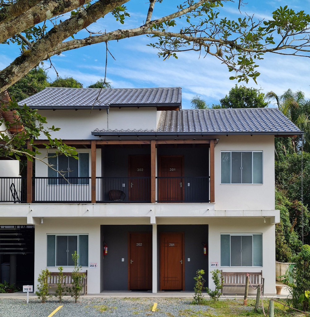 O edifício é composto por 2 blocos de 4 apartamentos cada, situado em um condomínio com outras casas e uma pousada.