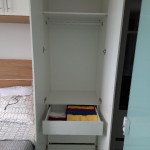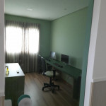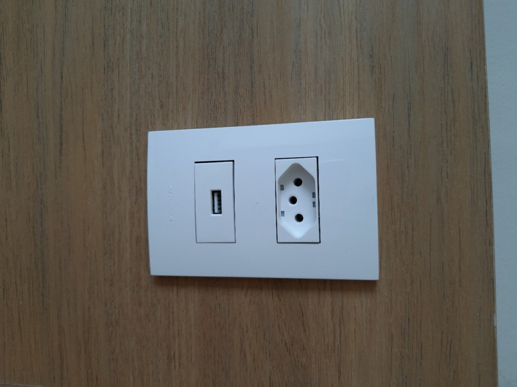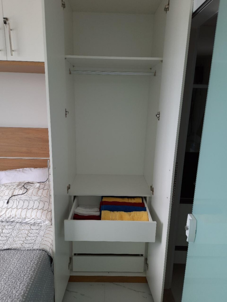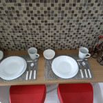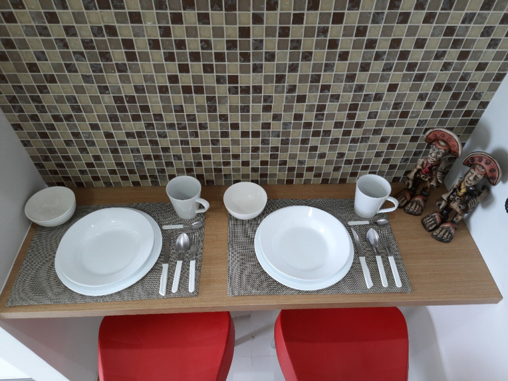 Armários na cozinha, suíte e WC. Cama de casal, sofá-cama (2 pessoas), toalhas banho e rosto, travesseiros, lençóis, cobertores, TV, Fornos microondas e elétrico, geladeira, cooktop, torradeira, liquidificador, cafeteira, pratos, talheres, copos e taças para vinho. Mesa para refeições, pode ser usada para trabalho on-line.
