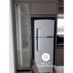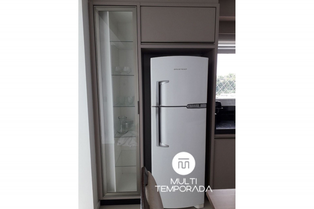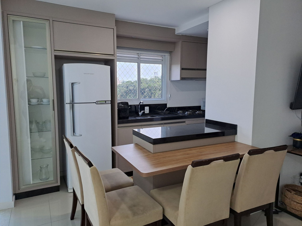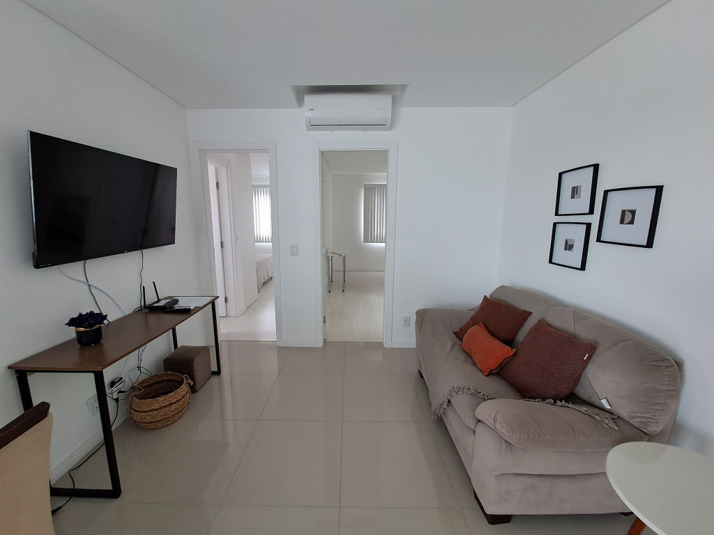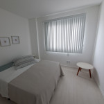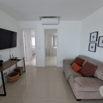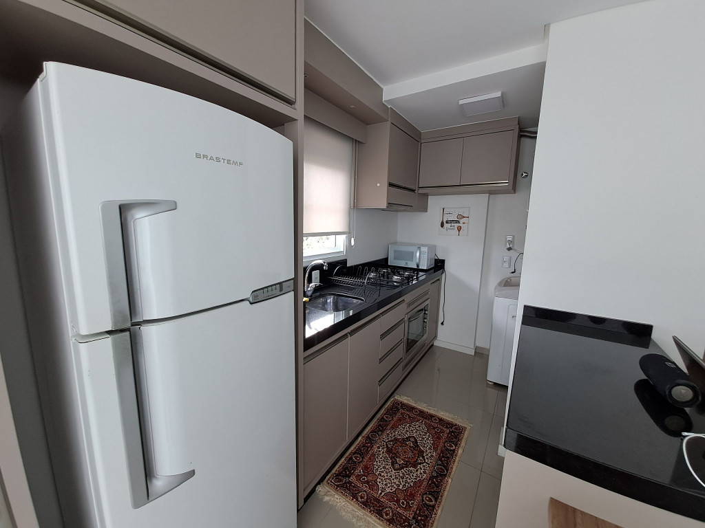 Apartamento com duas suítes com cama de casal, sendo uma com roupeiro. Possui 01 lavabo social, sala climatizada, cozinha com geladeira, fogão cooktop, forno elétrico, microondas e todos os utensílios necessários para cozinha. Área de serviço é conjugada com a cozinha e possui máquina de lavar roupa. O condomínio tem a disposição 1 vaga de garagem coberta. Temos também uma excelente varanda com churrasqueira;