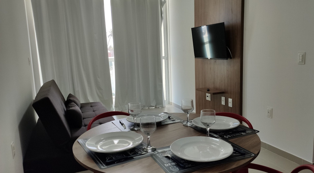 Apartamento com mobiliário novo, varanda e uma bela vista para o mar.