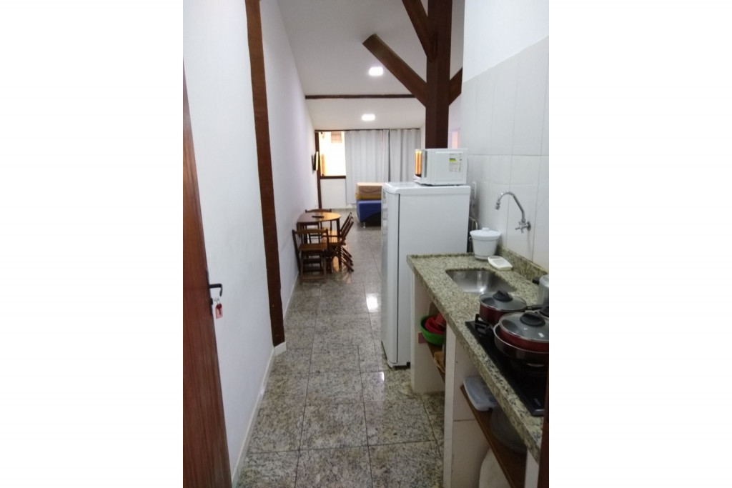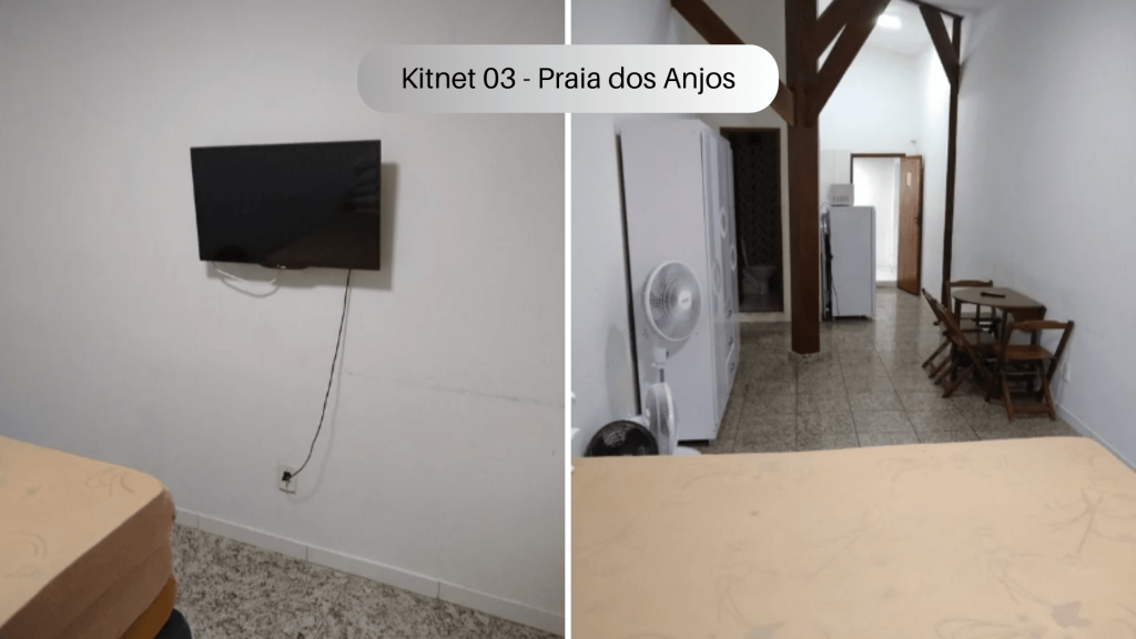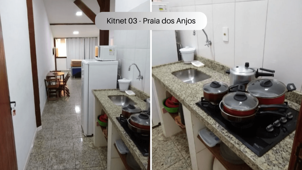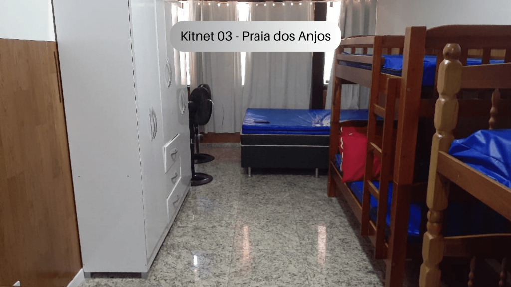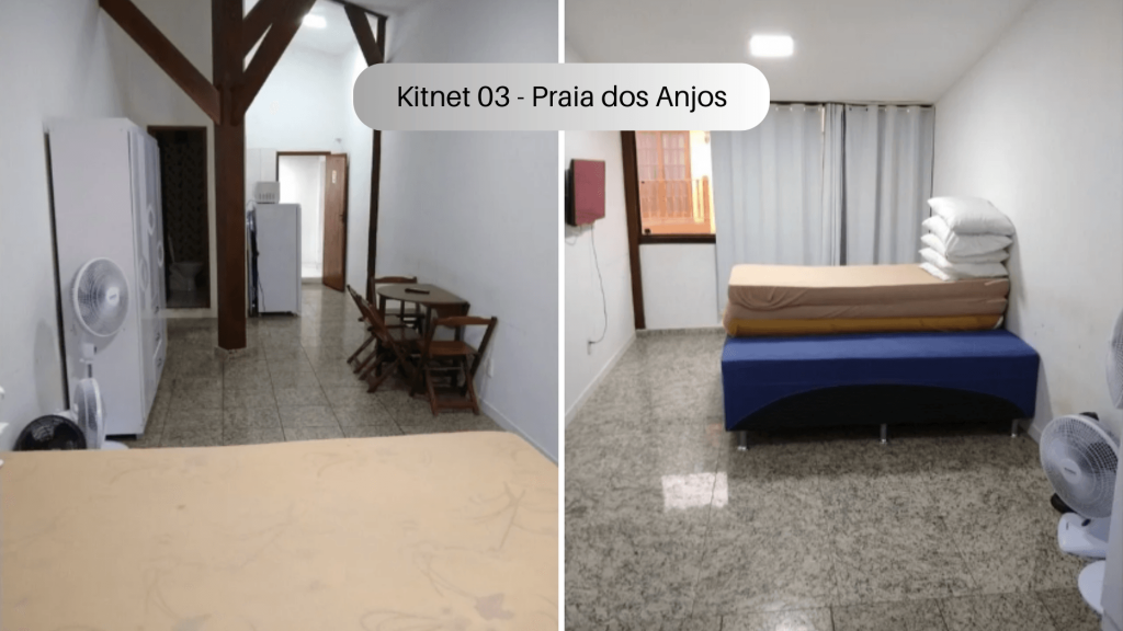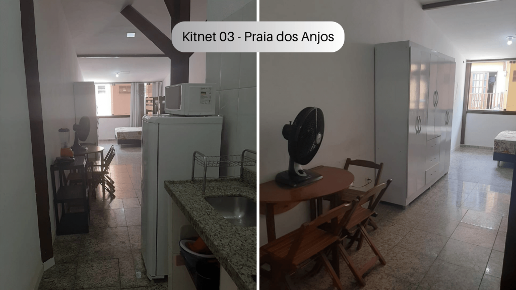 Imóvel com quarto, cozinha e banheiro localizado na Praia dos Anjos. No quarto, há uma cama e duas beliches. Na cozinha tem geladeira, forno Micro-ondas, fogão sem forno, utensílios de cozinha e louças. Não serão disponibilizados produtos de higiene pessoal, nem roupa de cama e banho. Há ventilador e TV com canais abertos. Wi-Fi disponível. Não há estacionamento. Há vários bares, restaurantes, mercados e farmácias bem próximos do imóvel. O imóvel fica no segundo andar, tendo que subir escadas.