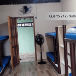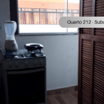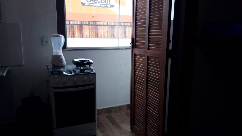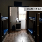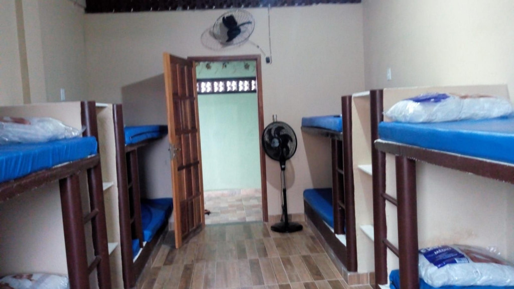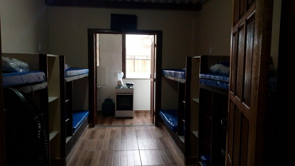 Imóvel com quarto e cozinha, sendo o banheiro de uso compartilhado. Há banheiros masculino e feminino. O quarto é equipado com TV, ventilador e 4 beliches, a cozinha é equipada com geladeira, forno Micro-ondas, fogão e utensílios. Não oferecemos roupa de cama, banho e produtos de higiene. Há Televisão no apartamento com os canais básicos da TV aberta. Há uma piscina para uso compartilhado. Wi-Fi disponível. Estacionamento incluso para um carro. Fica no segundo andar, tendo que subir escadas.