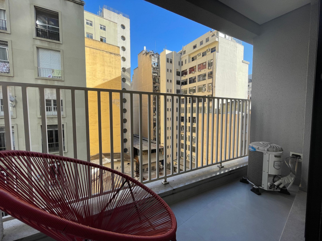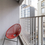 Uma varanda com porta de vidro separa os espaços. No local, há uma cadeira para o proveito do hóspede.