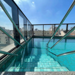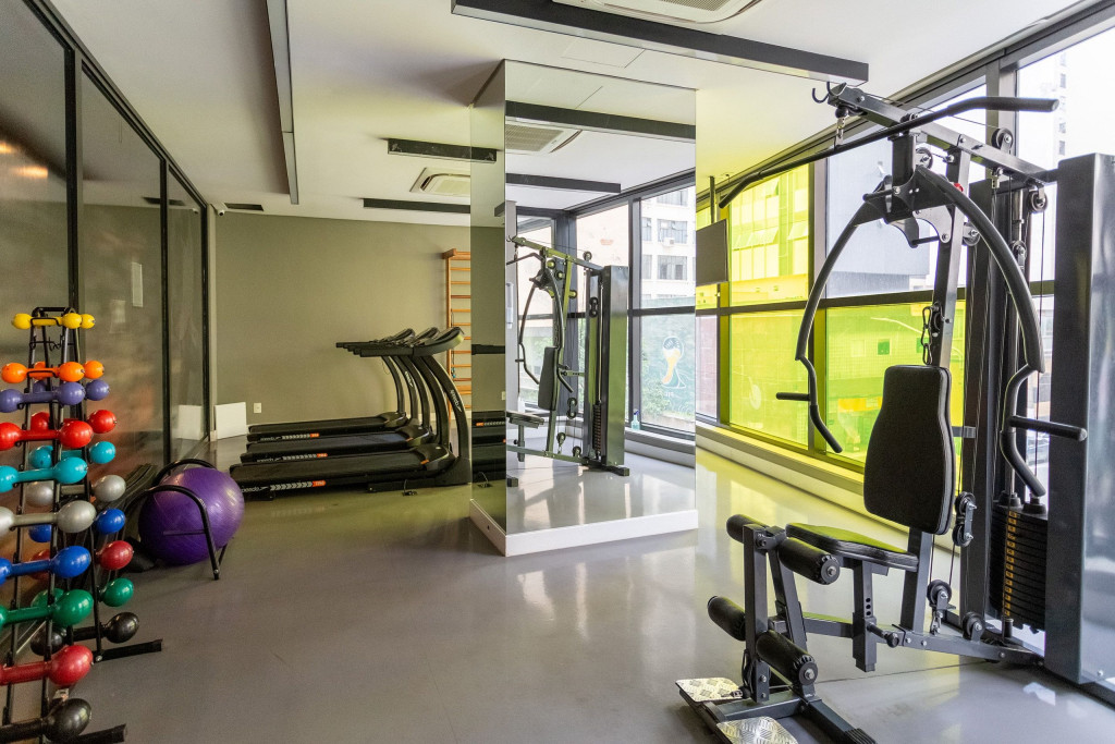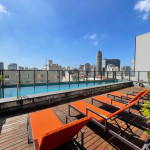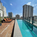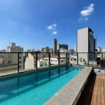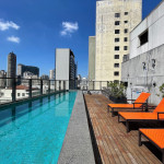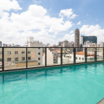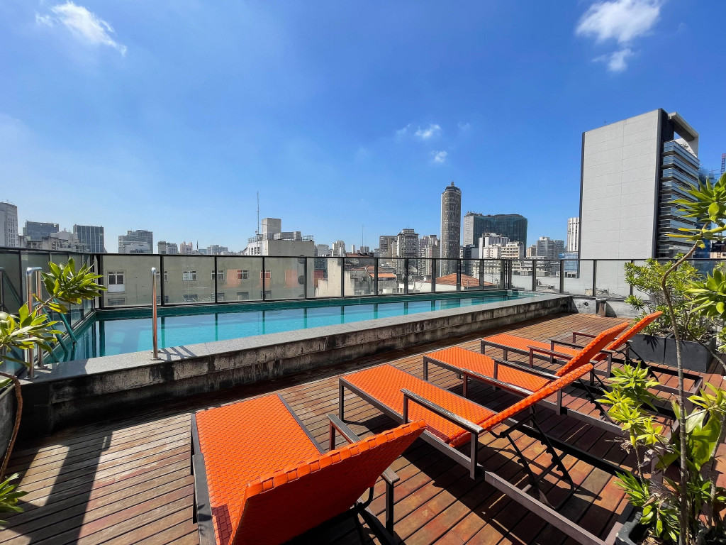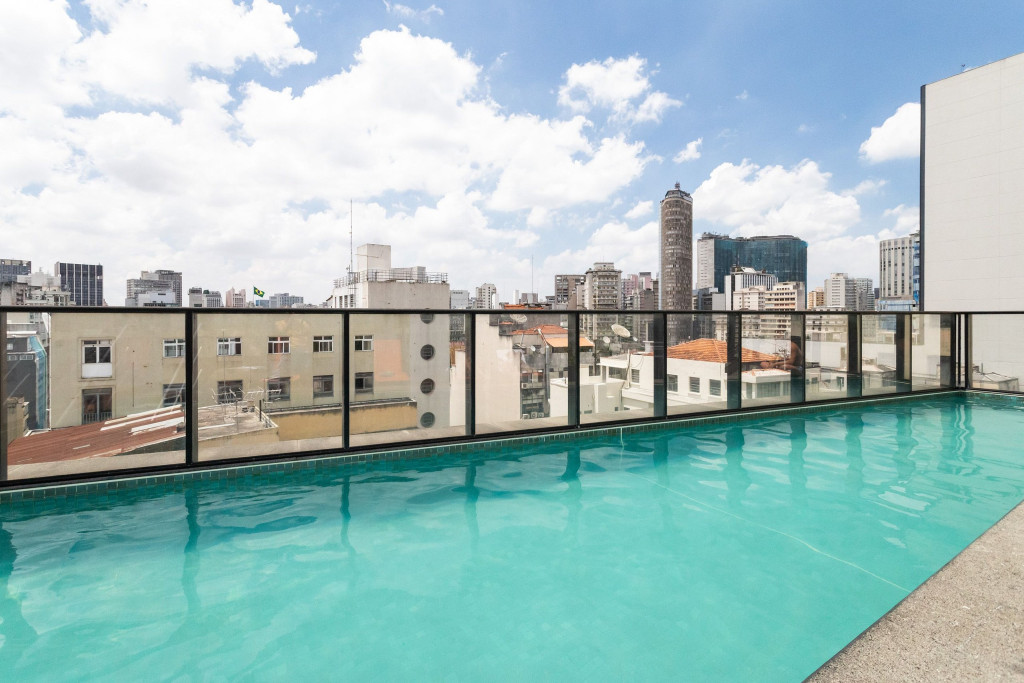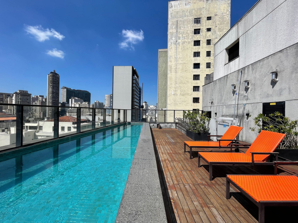O condomínio também conta com academia, espaço de coworking e uma piscina na cobertura que tem uma vista para edifícios históricos como o Copan e o Terraço Itália.