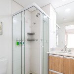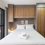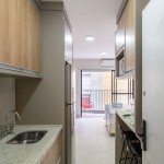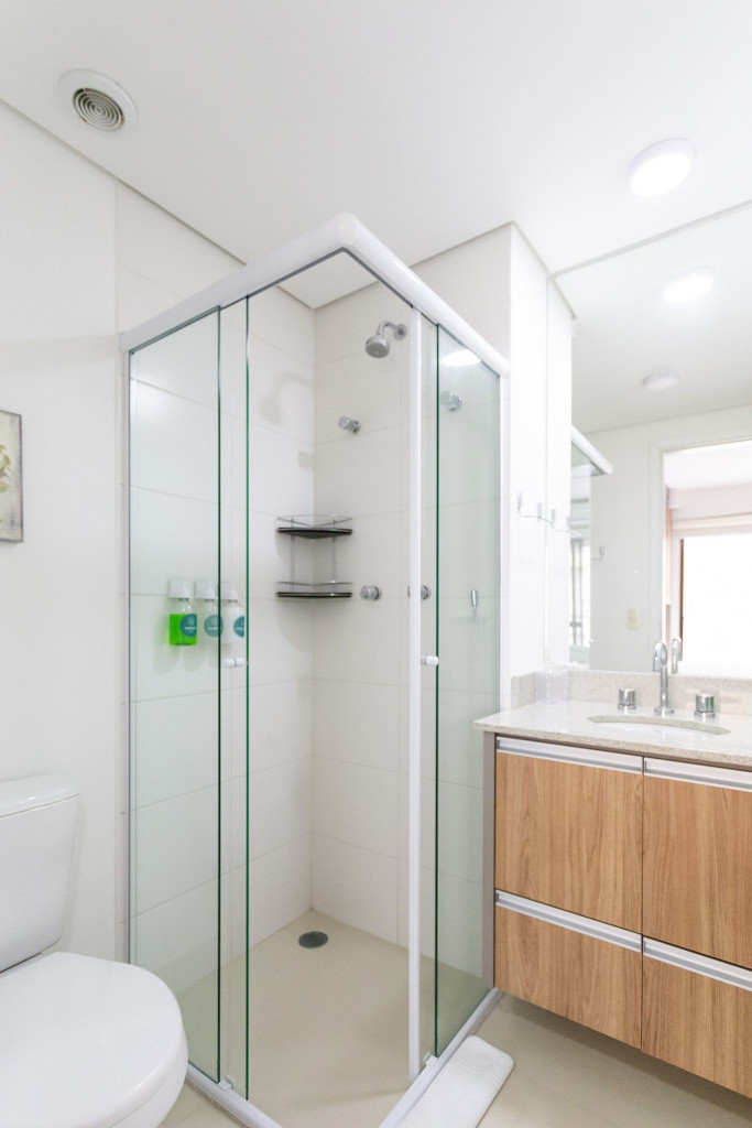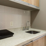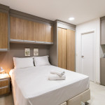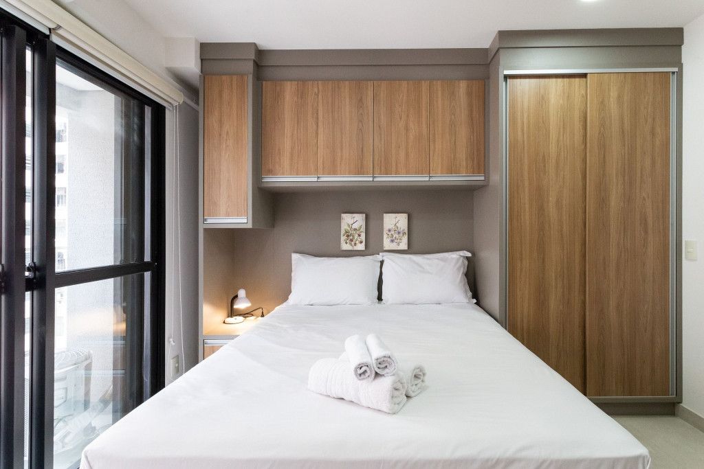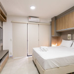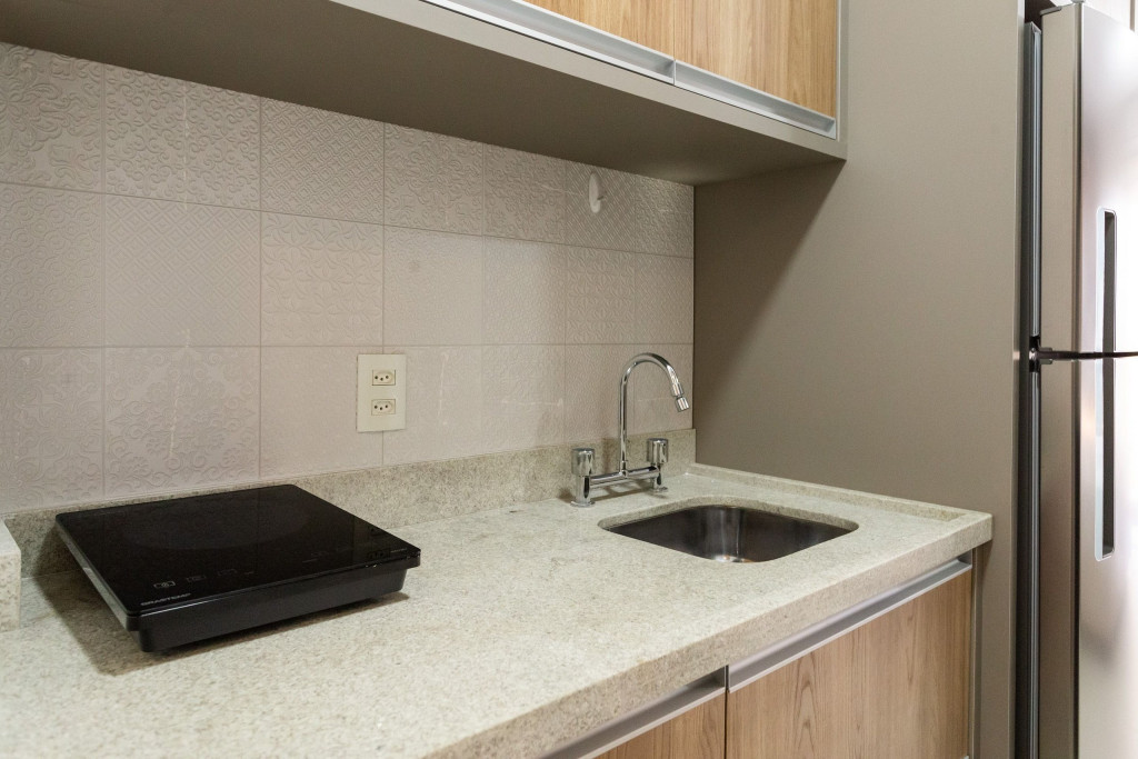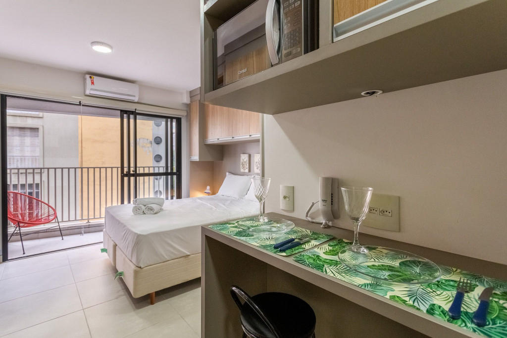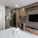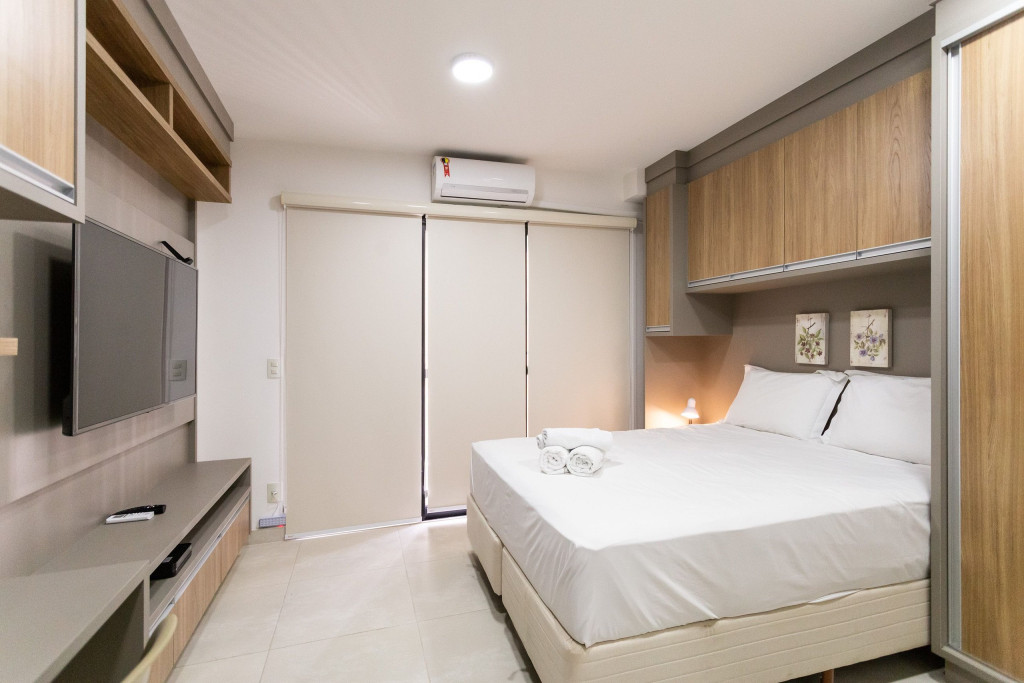 No mesmo ambiente dispomos de uma cozinha com utensílios necessários para uma estadia prática, banheiro, armários, escrivaninha para home office e TV Smart. Dispomos, também, de ar-condicionado e WI-FI de alta velocidade.