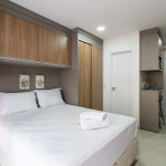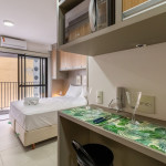 O ambiente do studio é em conceito aberto e acomoda até 2 pessoas em cama queen.