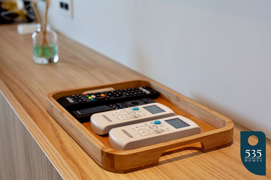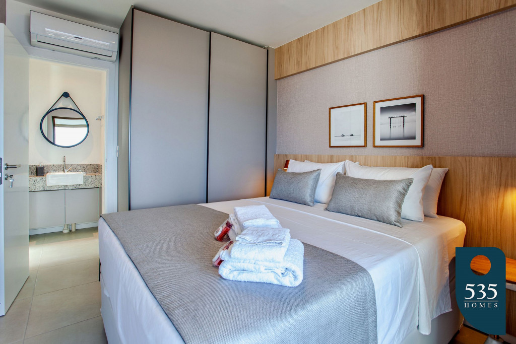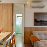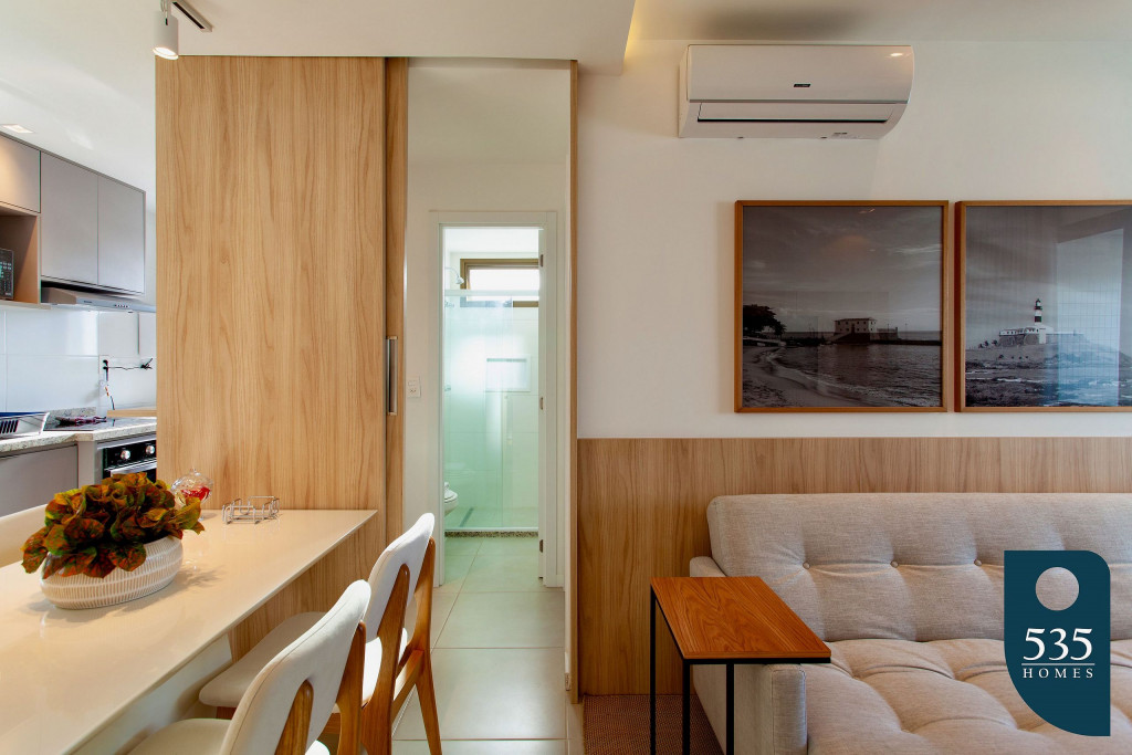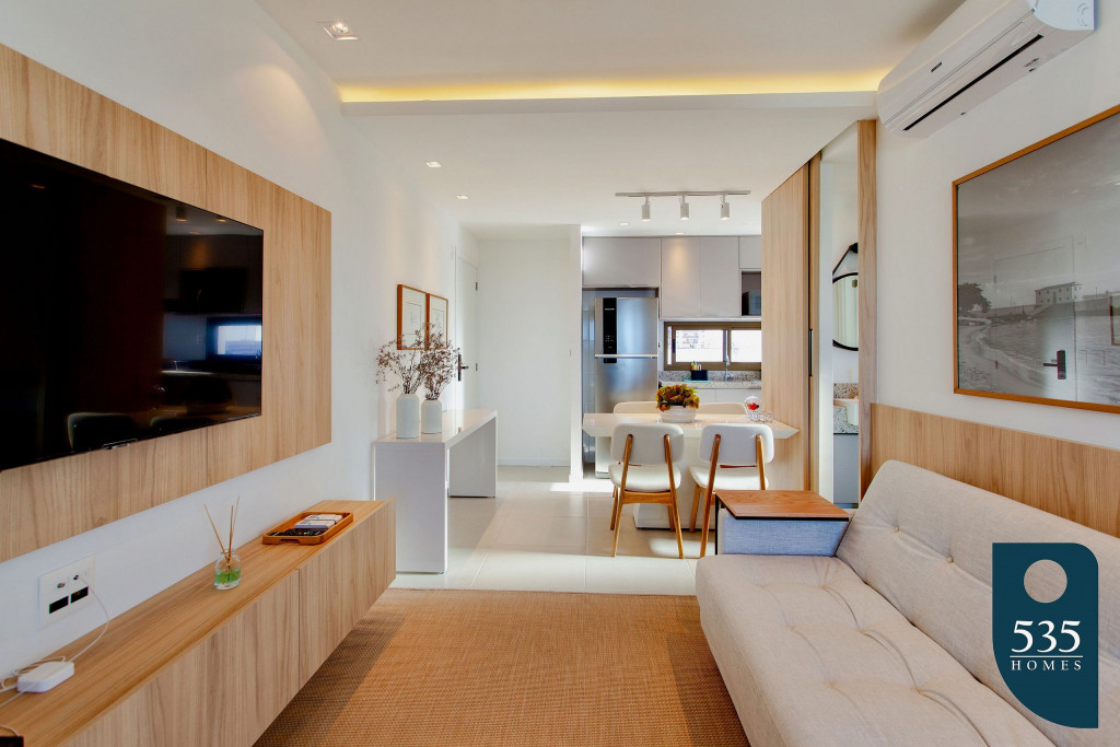 Apartamento com ar condicionado na sala e no quarto.