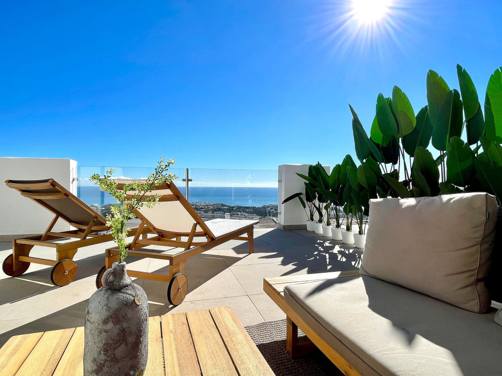 Desenhada, totalmente equipada e mobilada, casa de férias única com excelente vista mar a partir do terraço. Banheira de hidromassagem privativa no terraço privativo superior. 3 quartos e 2 banheiros. A quadra de Padel é gratuita para uso durante a estadia. Este é um excelente complexo de apartamentos com uma área de piscina muito bonita e de estilo tropical com vista para o mar e Benalmádena.