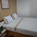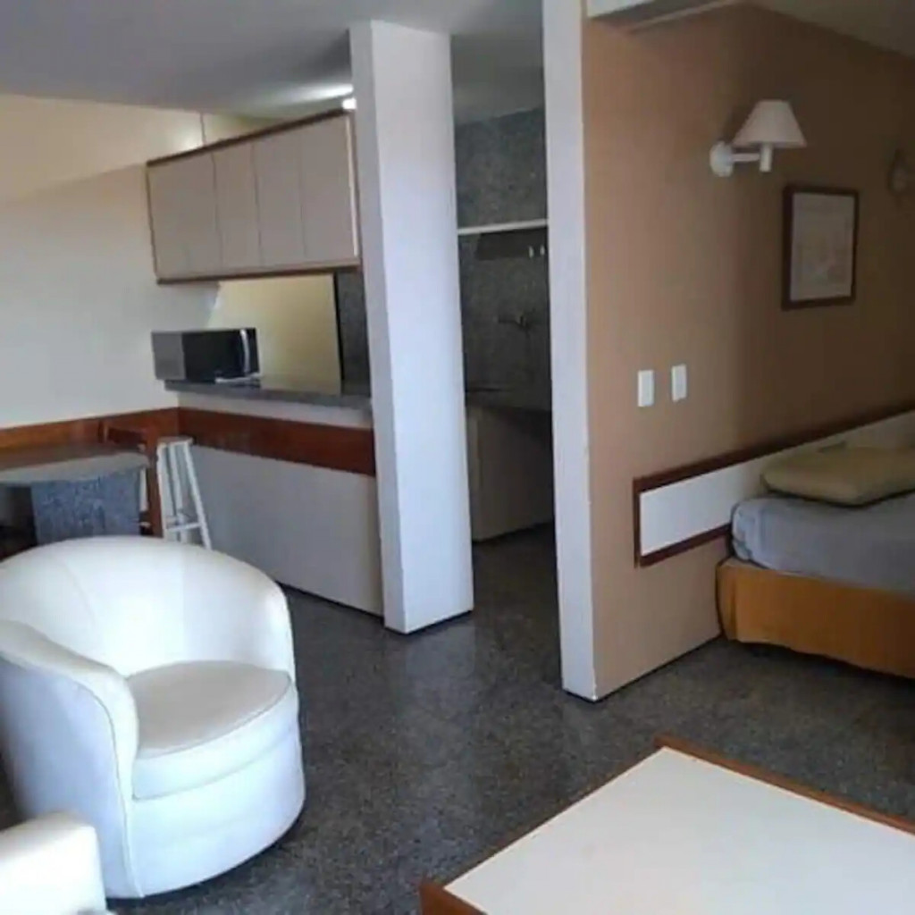 Confortável Flat com 1 quarto, sala estar/jantar, wc social, varanda com vista para o mar, muito ventilado. Mobiliado com duas camas de solteiro no quarto, armários fixos, sofá na sala, tv LCD na sala com canais á cabo, internet wi-fi, serviço de limpeza diária, e 1 vaga de garagem. Entregamos com uma muda de roupa de cama e banho para cada hóspede para uso da temporada. A hospedagem não dará direito ao café da manhã.