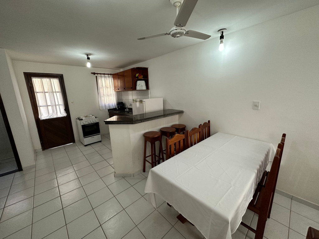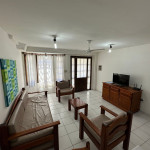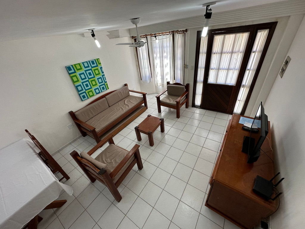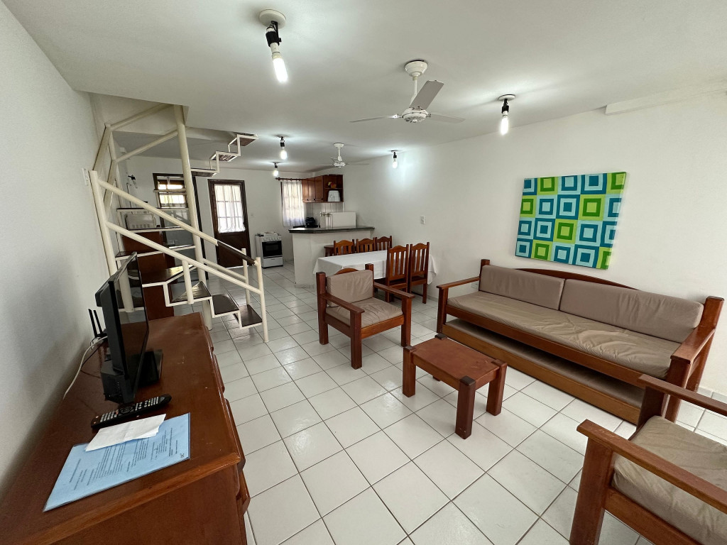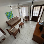 Logo na entrada possui uma ampla sala conjugada com a copa, no qual são compostas com sofá cama de madeira com espumas e almofadas, (acomoda 2 pessoas), 2 poltronas ,mesa de centro, ventilador de teto, rack e TV tela plana. Mesa de madeira com 6 cadeiras.