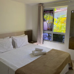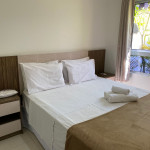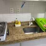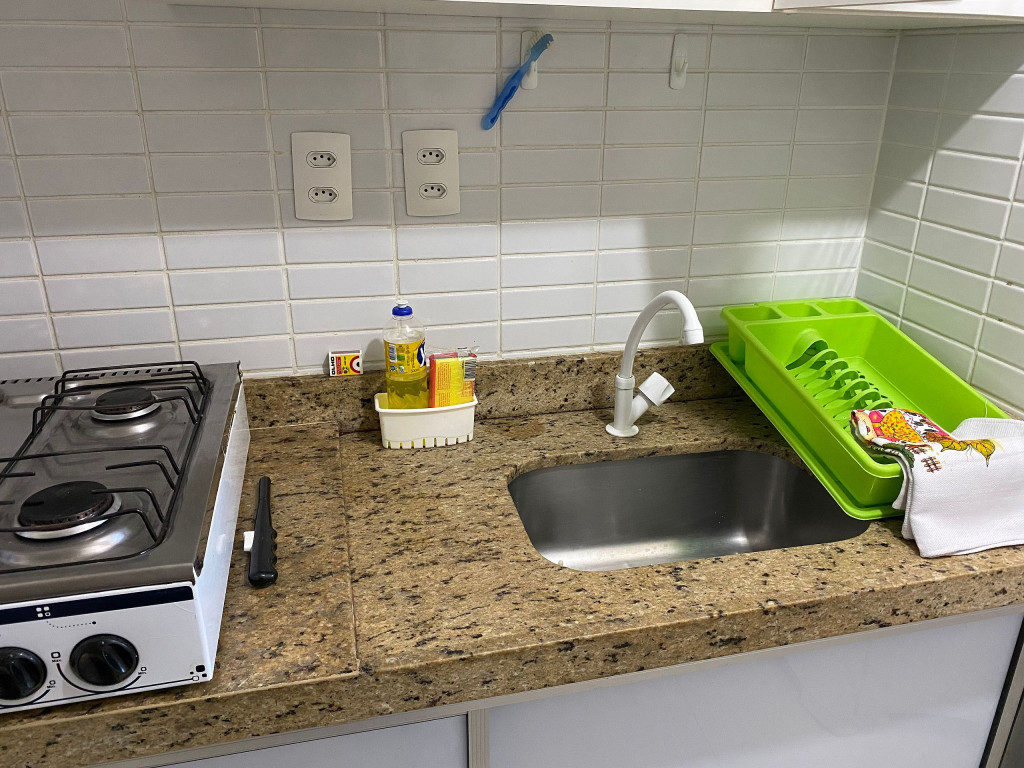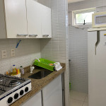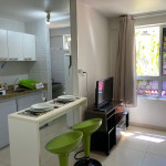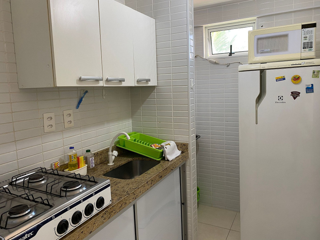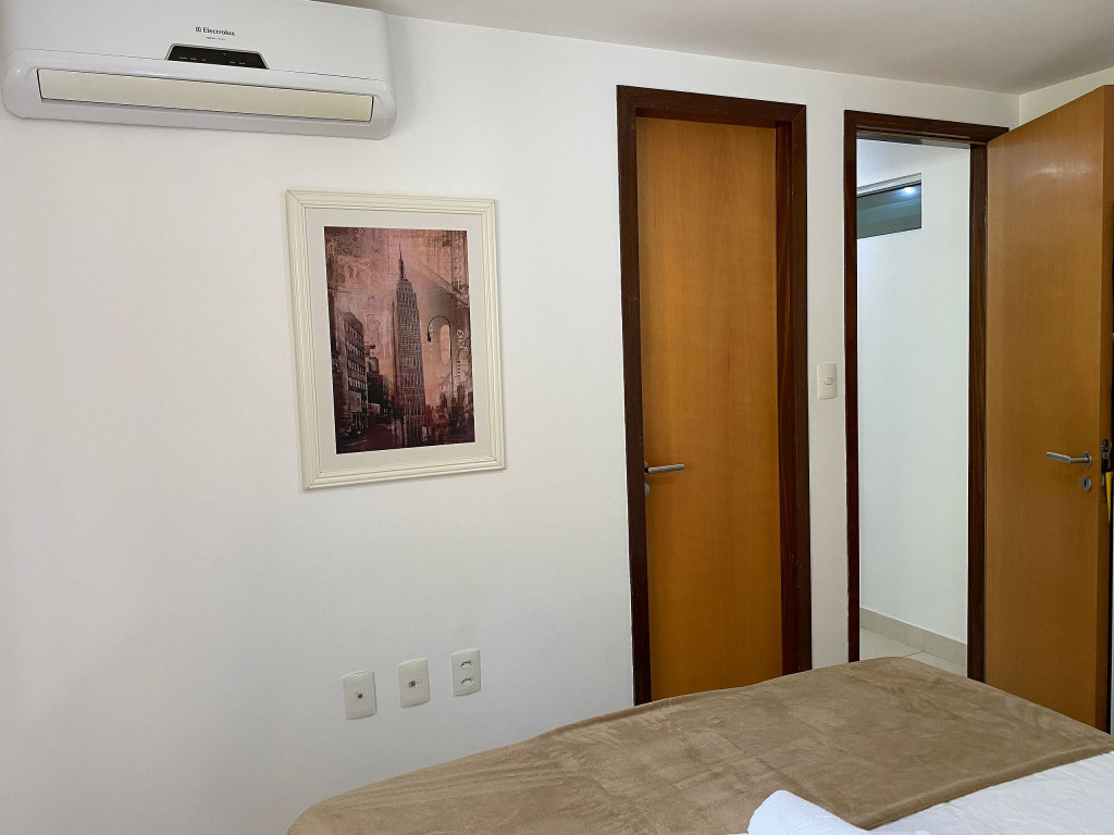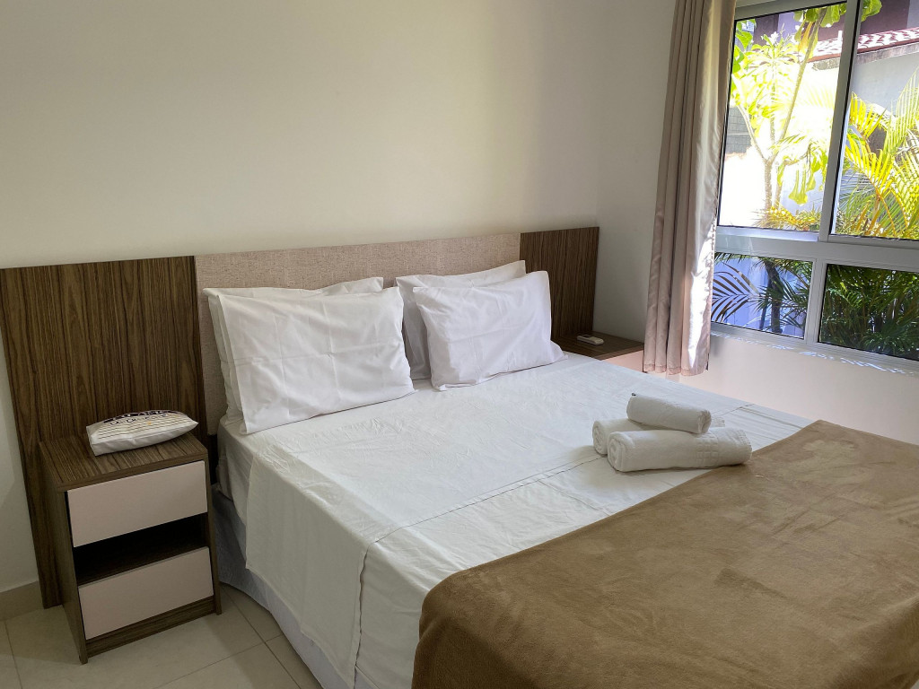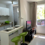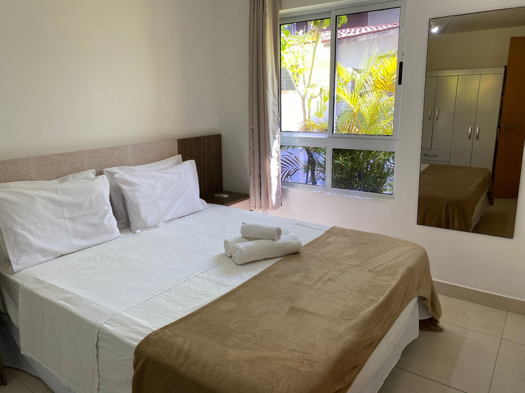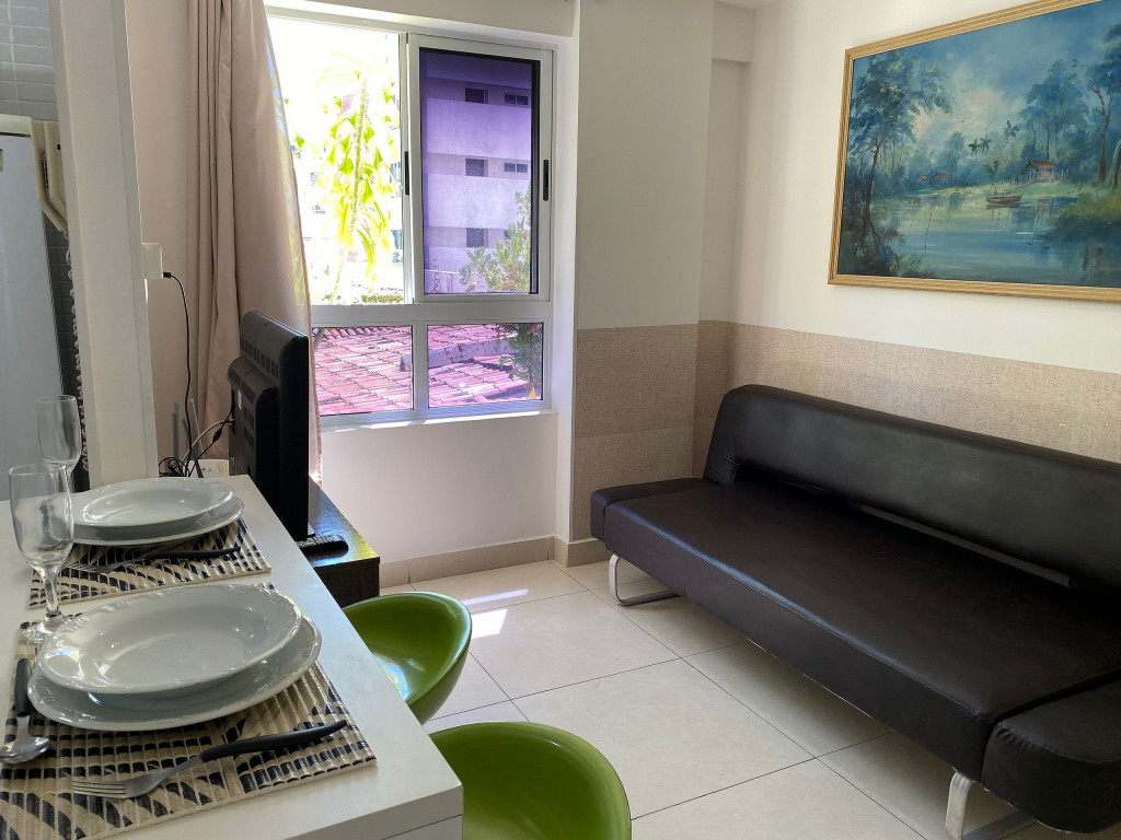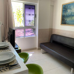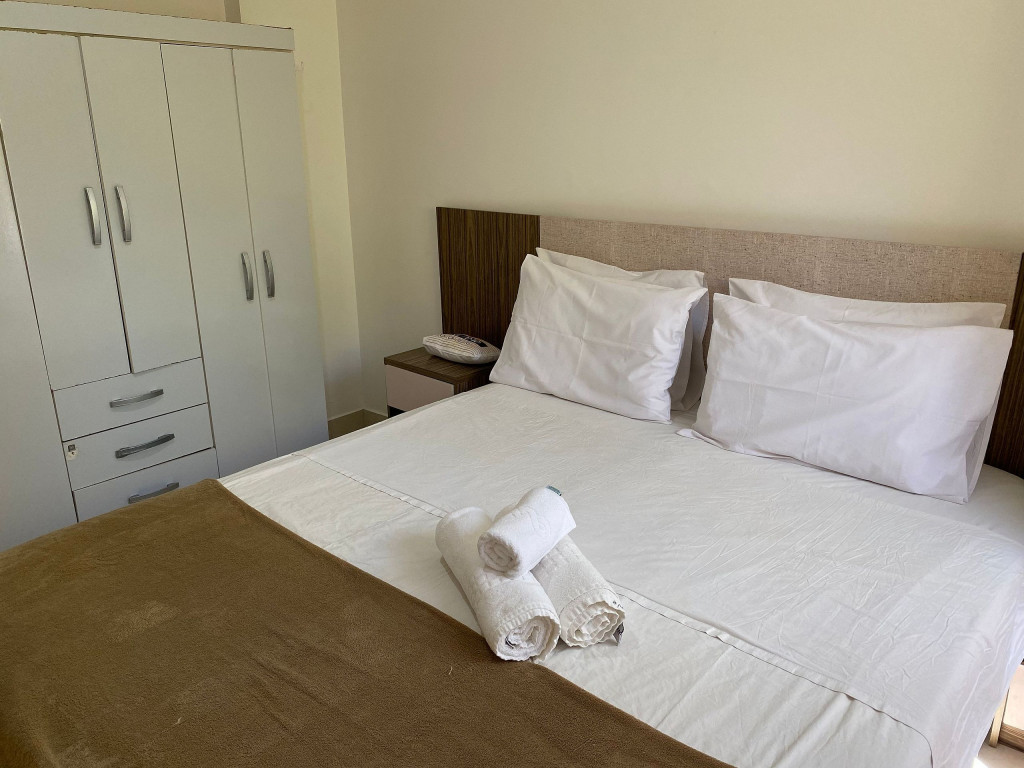 O apartamento é mobiliado e equipado com microondas, geladeira, sanduicheira, liquidificador, louças e talheres , além de dispor de enxoval como lençóis, toalhas e travesseiros para a sua entrada.Quarto com cama casal, espelho, guarda roupa e ar condicionado split.Sala com sofá cama solteiro.