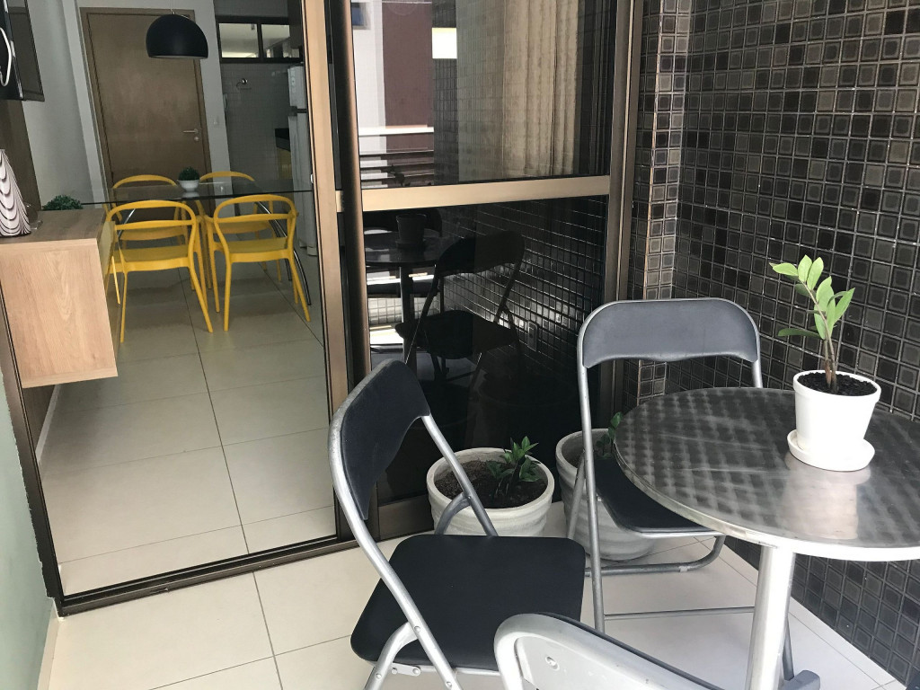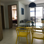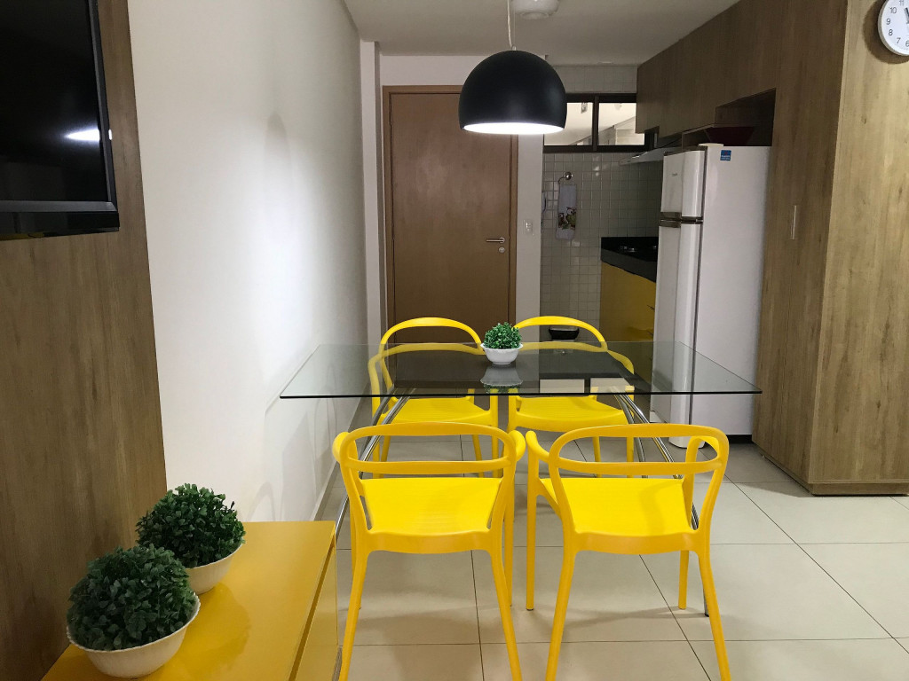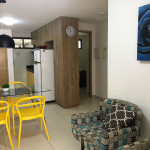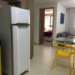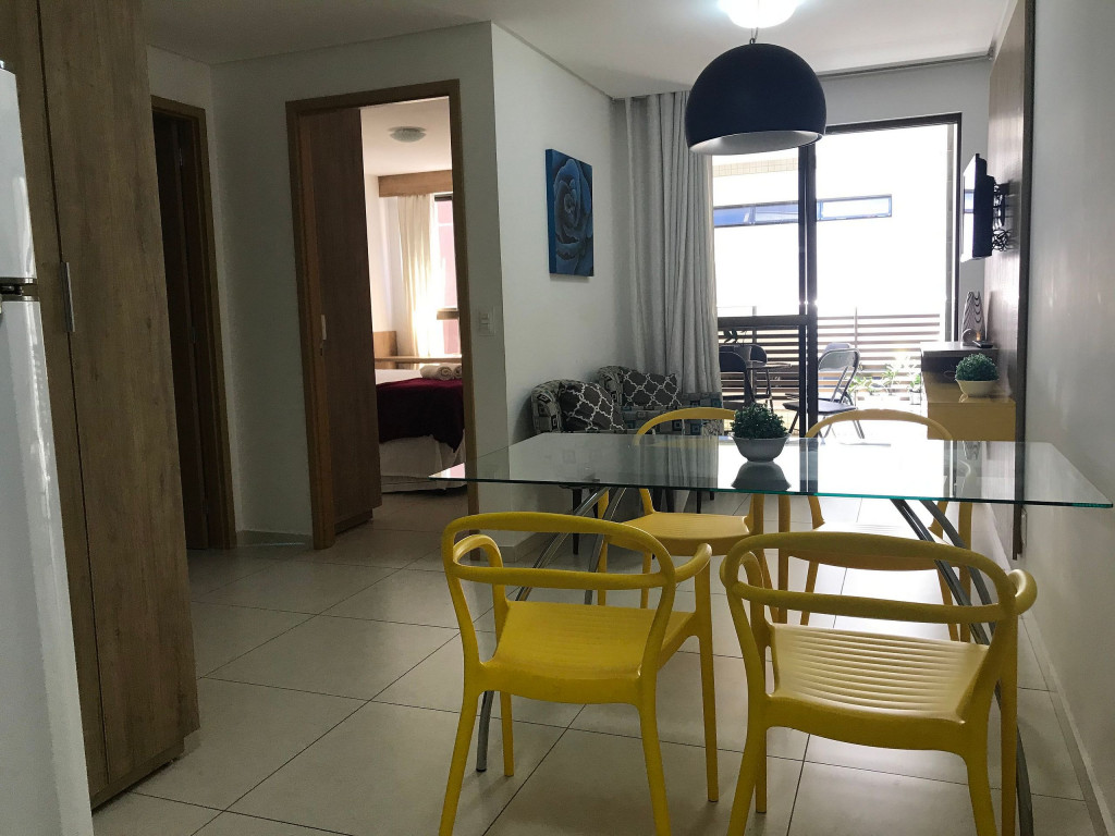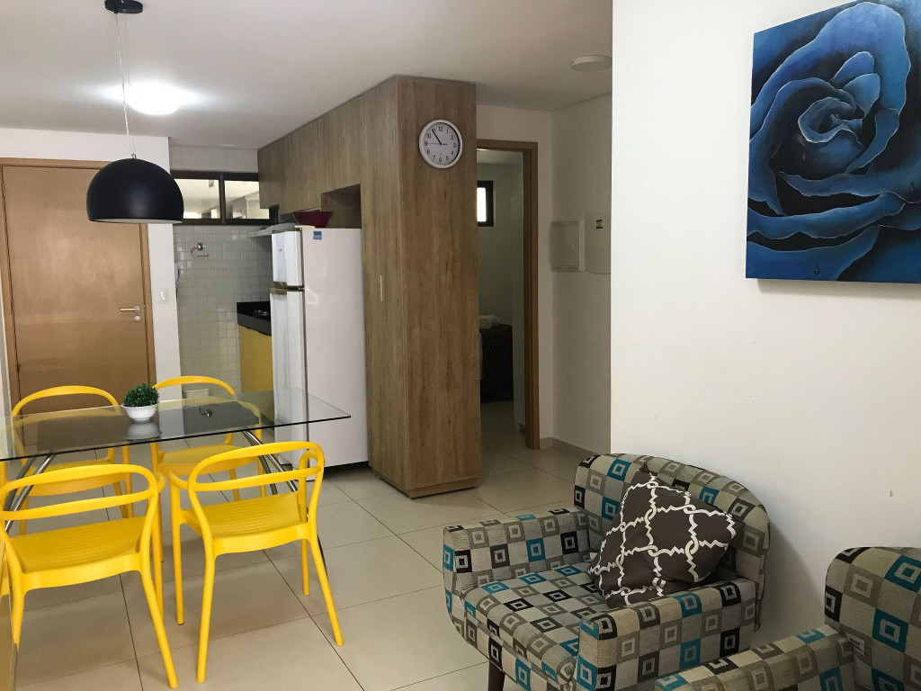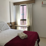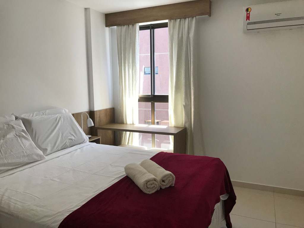 O flat possui sala, cozinha integrada, varanda, banheiro social e 02 quartos com ar-condicionado, equipados com cama de casal e uma cama box solteiro com cama auxiliar embaixo, ideal para acomodar até 04 pessoas.