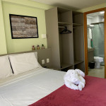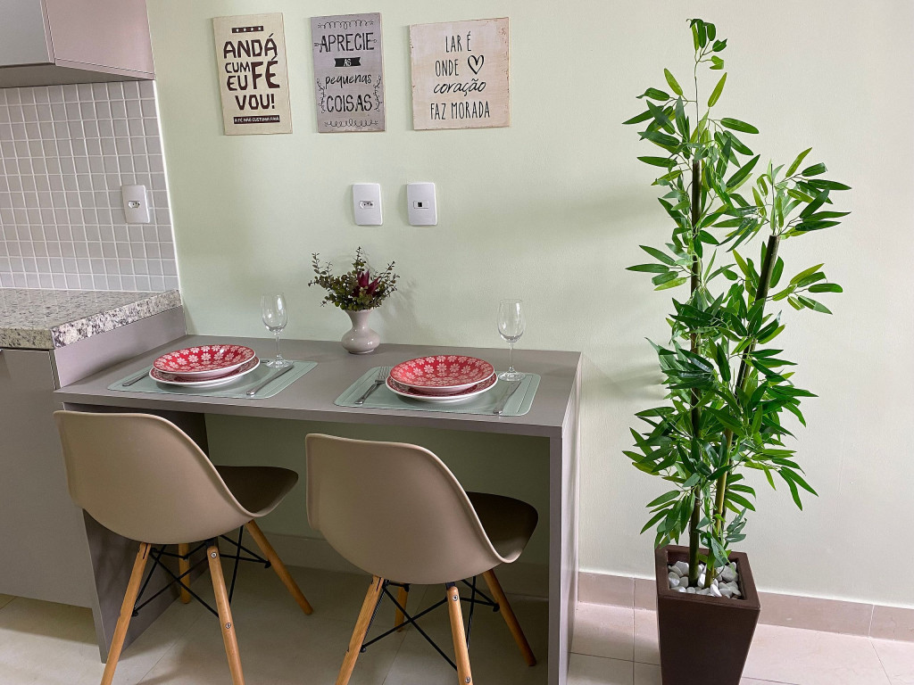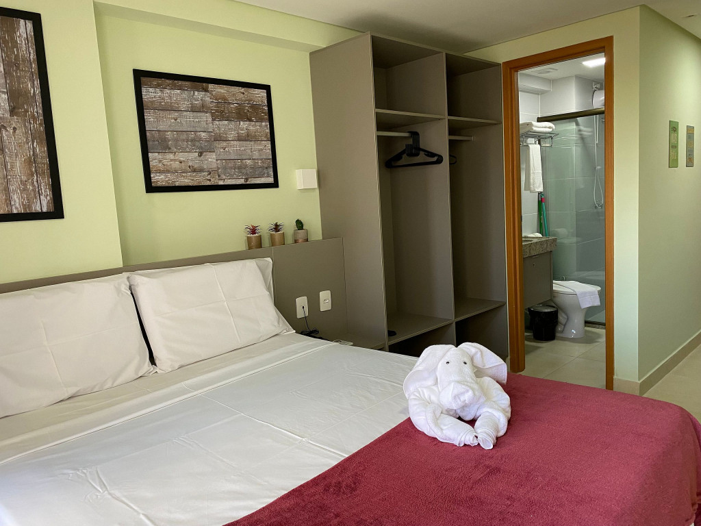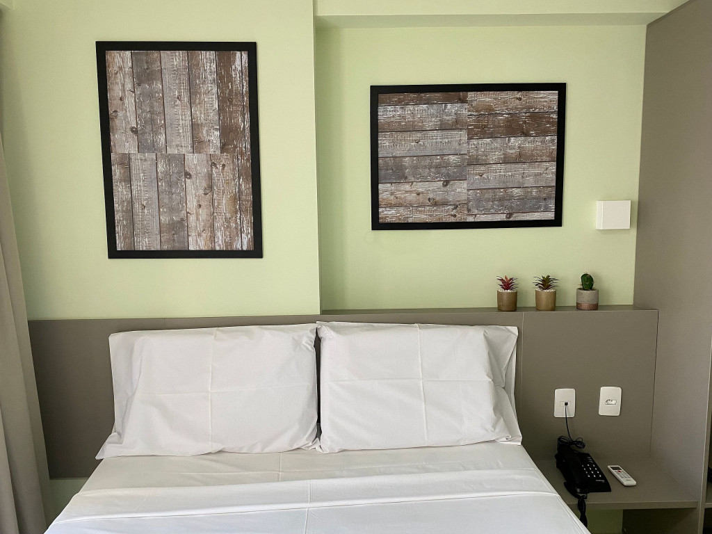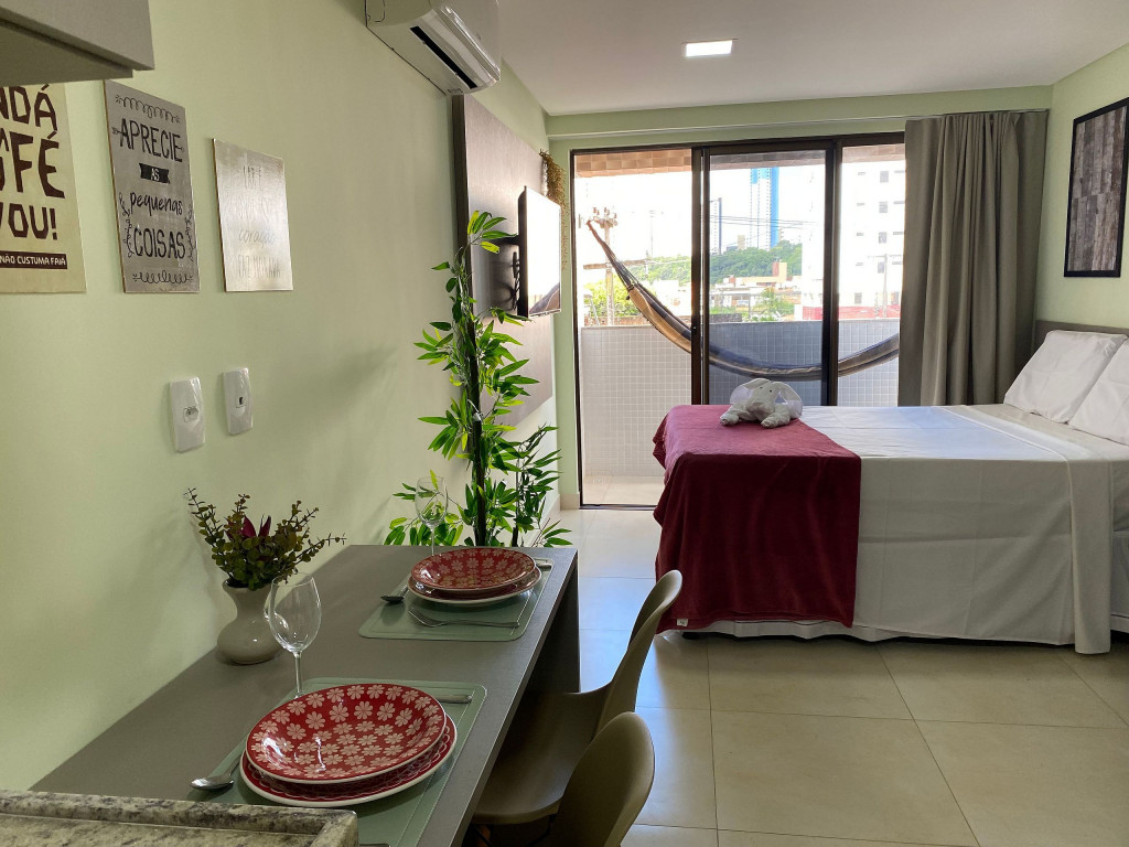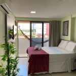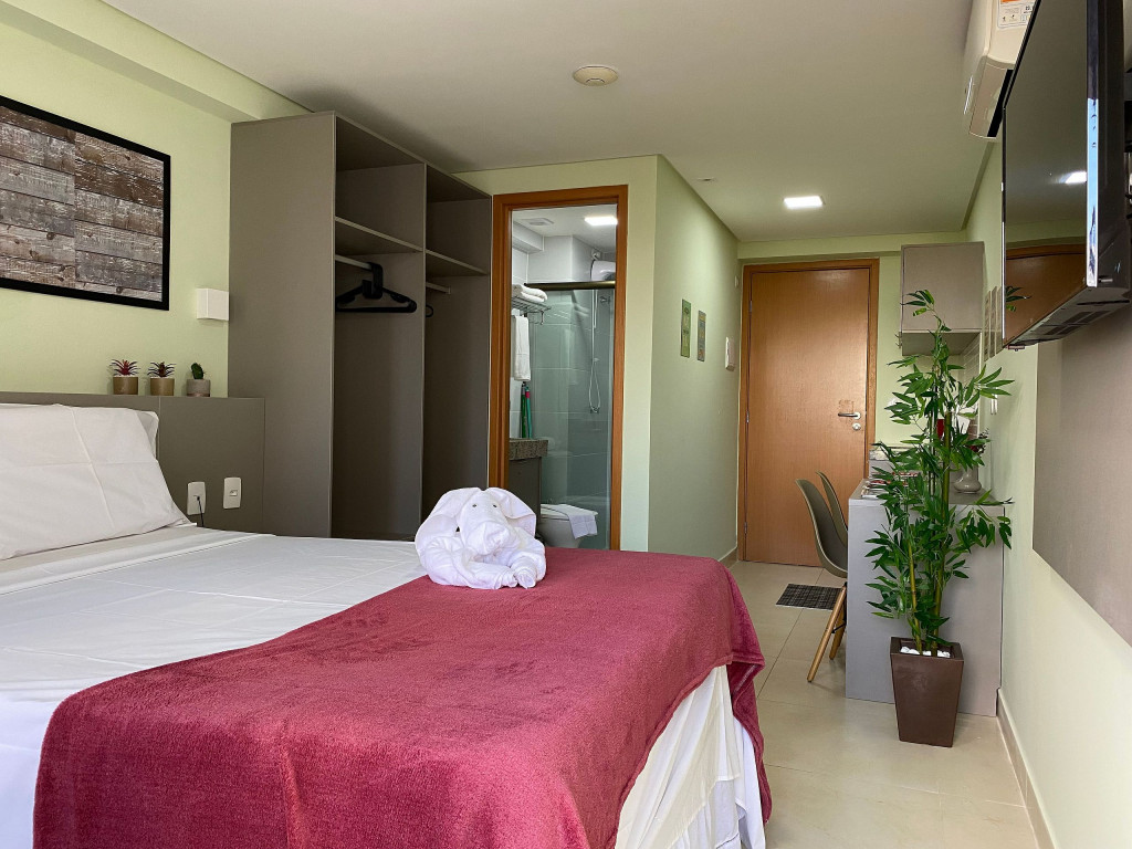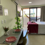 O studio é mobiliado e equipado com microondas, frigobar, cafeteira, liquidificador, louças e talheres , além de dispor de enxoval como lençóis, toalhas e travesseiros para a sua entrada.