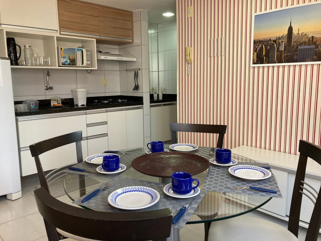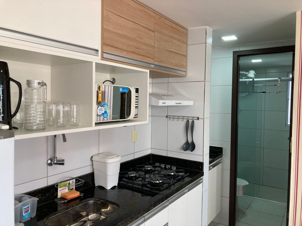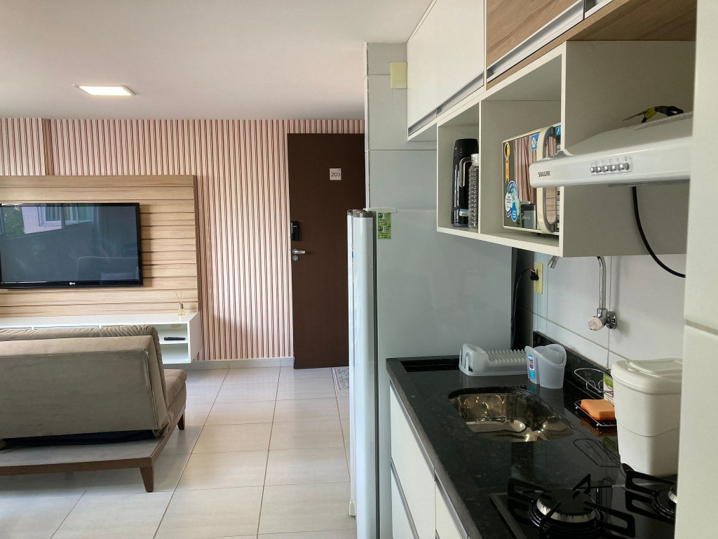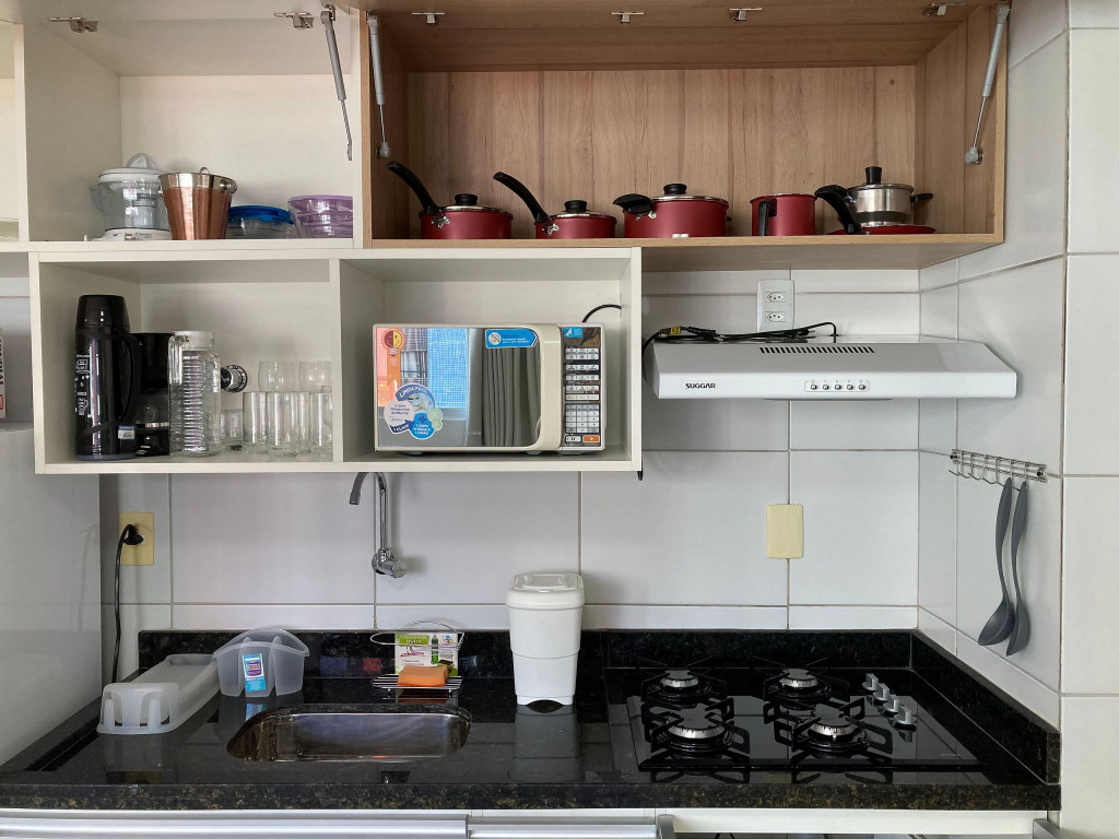 O flat é mobiliado e equipado com utensílios para preparo de refeições como lanches e bebidas, além de dispor de enxoval completo de lençóis, toalhas e travesseiros para a sua entrada.Possui cozinha compacta equipada com micro-ondas, liquidificador, geladeira, cooktop, sanduicheira, cafeteira, louças e talheres.