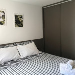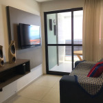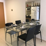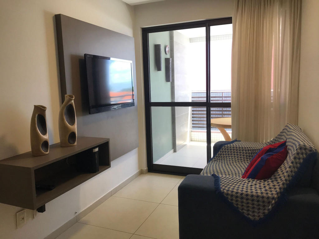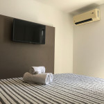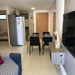 O flat possui sala, cozinha integrada, varanda, banheiro social e 02 quartos com ar-condicionado, equipados com cama de casal e uma cama box solteiro com cama auxiliar embaixo, ideal para acomodar até 04 pessoas.
