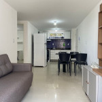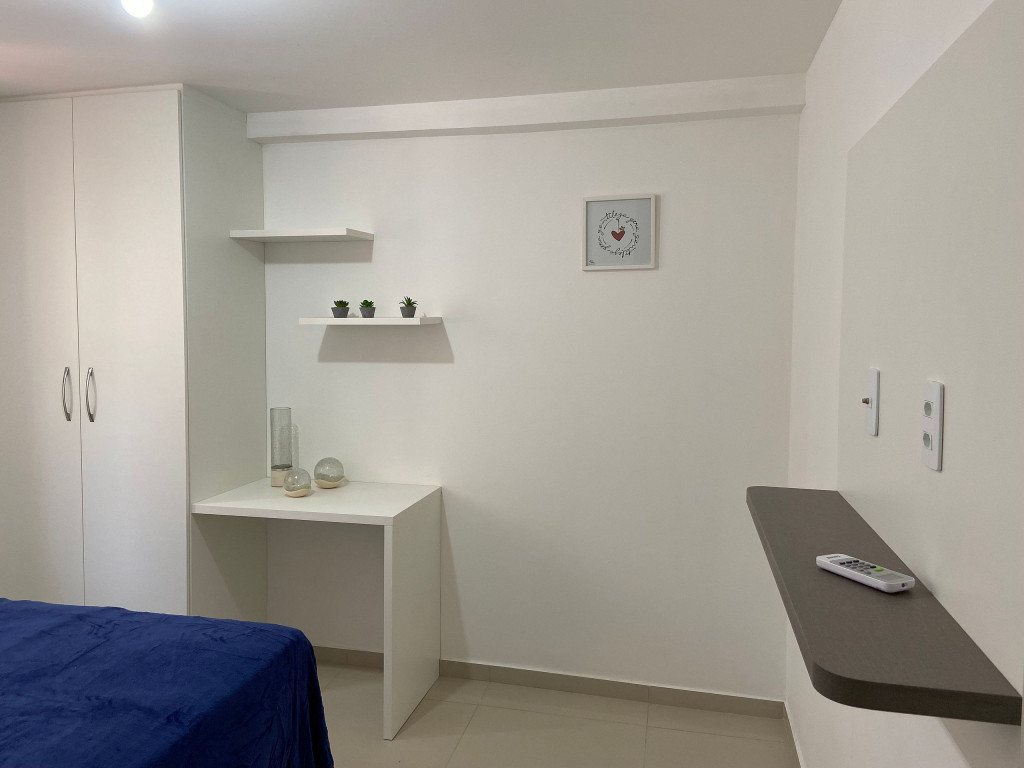 O flat possui dois quartos, sendo 01 suíte com TV, equipados com cama casal, acomodação até 04 pessoas.Possui também armários, ar-condicionado split, cozinha americana com fogão 04 bocas e forno, geladeira, liquidificador, panelas, pratos, copos e talheres. Nossos hóspedes contam com wi-fi privativa do apartamento, 01 vaga numerada para carro, lavanderia no condomínio com máquina de lavar e secar, além de piscina na cobertura do edifício.