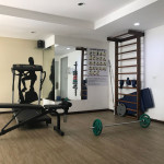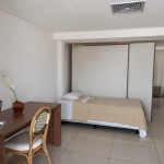Possui 01 cama casal+ 02 camas solteiro, tv tela plana, ar-condicionado central, mini cozinha com itens básicos, armário com cabides, mesas de cabeceira, mesa de trabalho com cadeira.