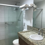 Banheiro com secador de cabelos, chuveiro de água quente, box de vidro, ducha higiênica.