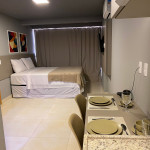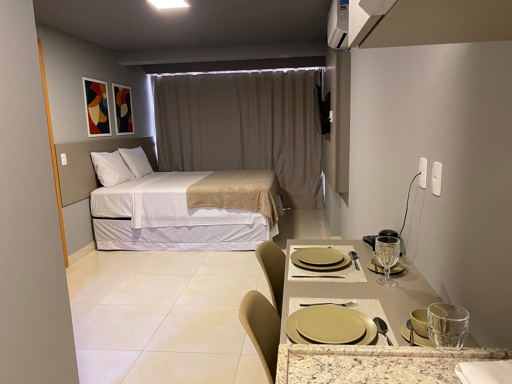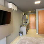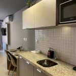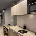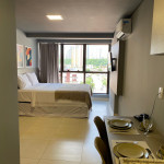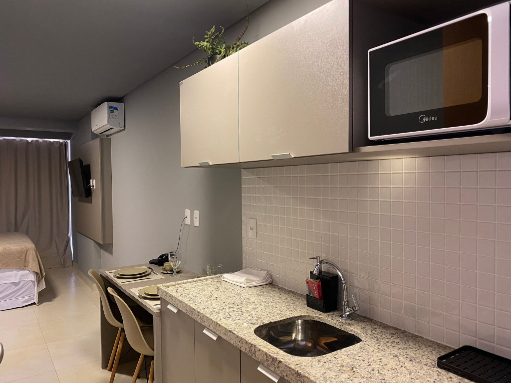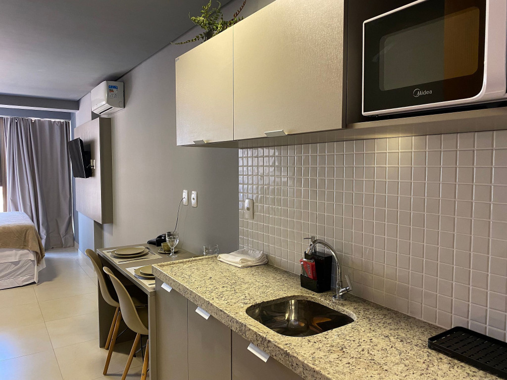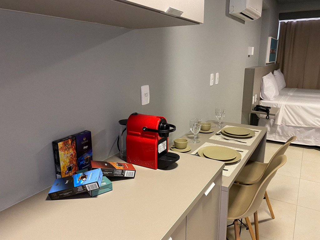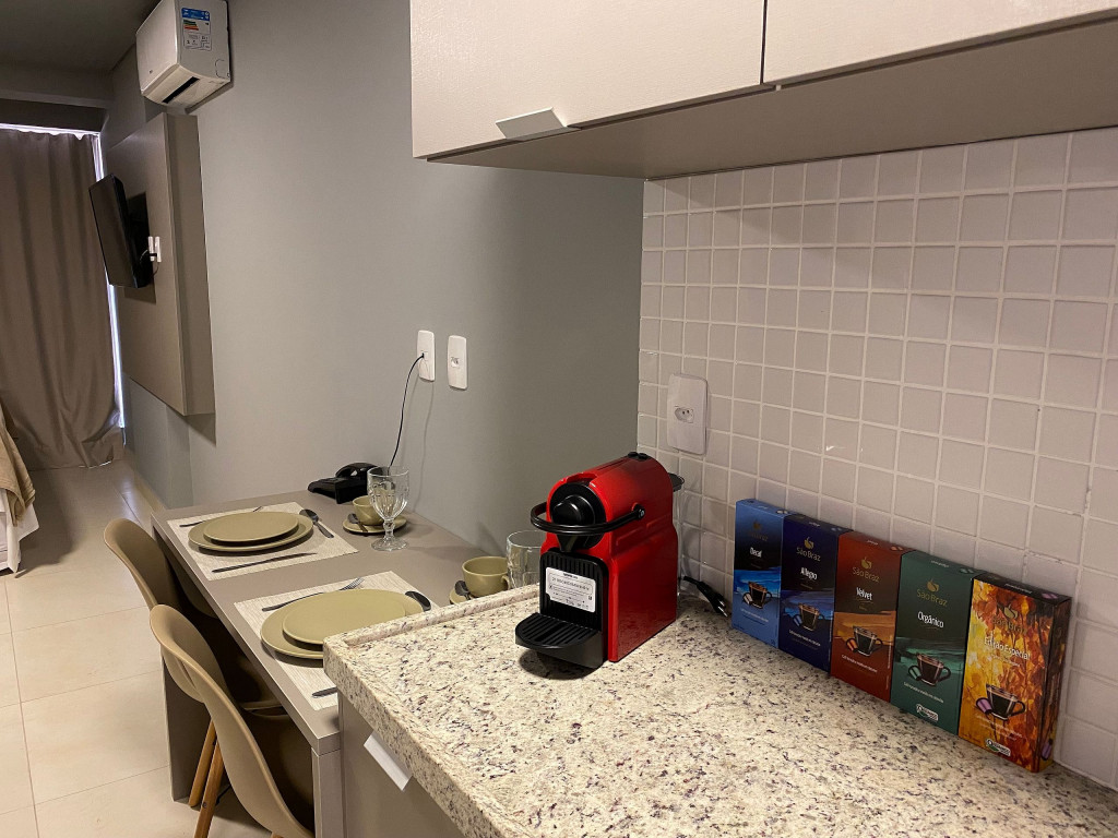 O studio é mobiliado e equipado com microondas, frigobar e cafeteira de cápsula , além de dispor de enxoval como lençóis, toalhas e travesseiros para a sua entrada.