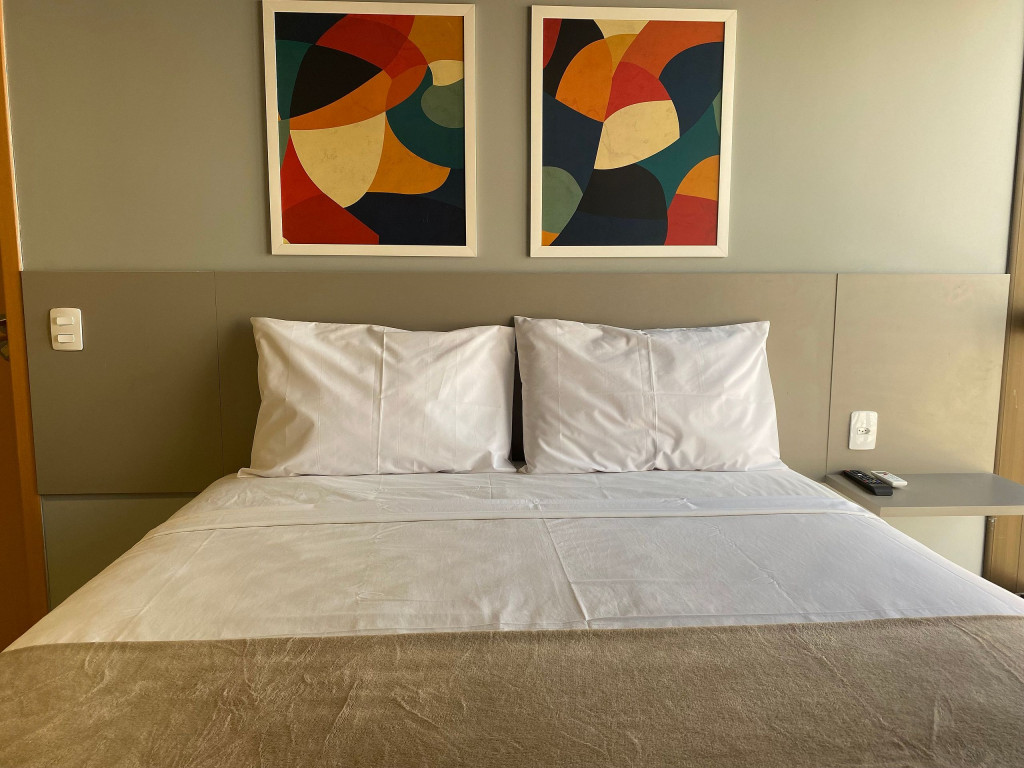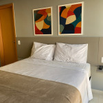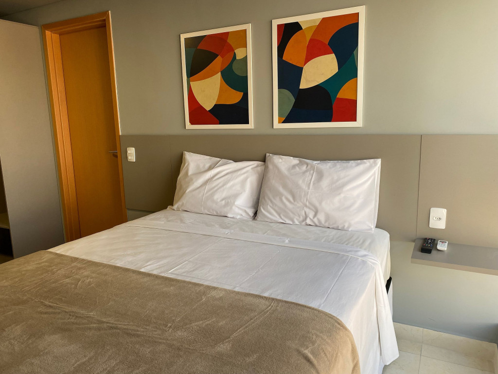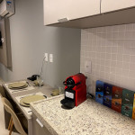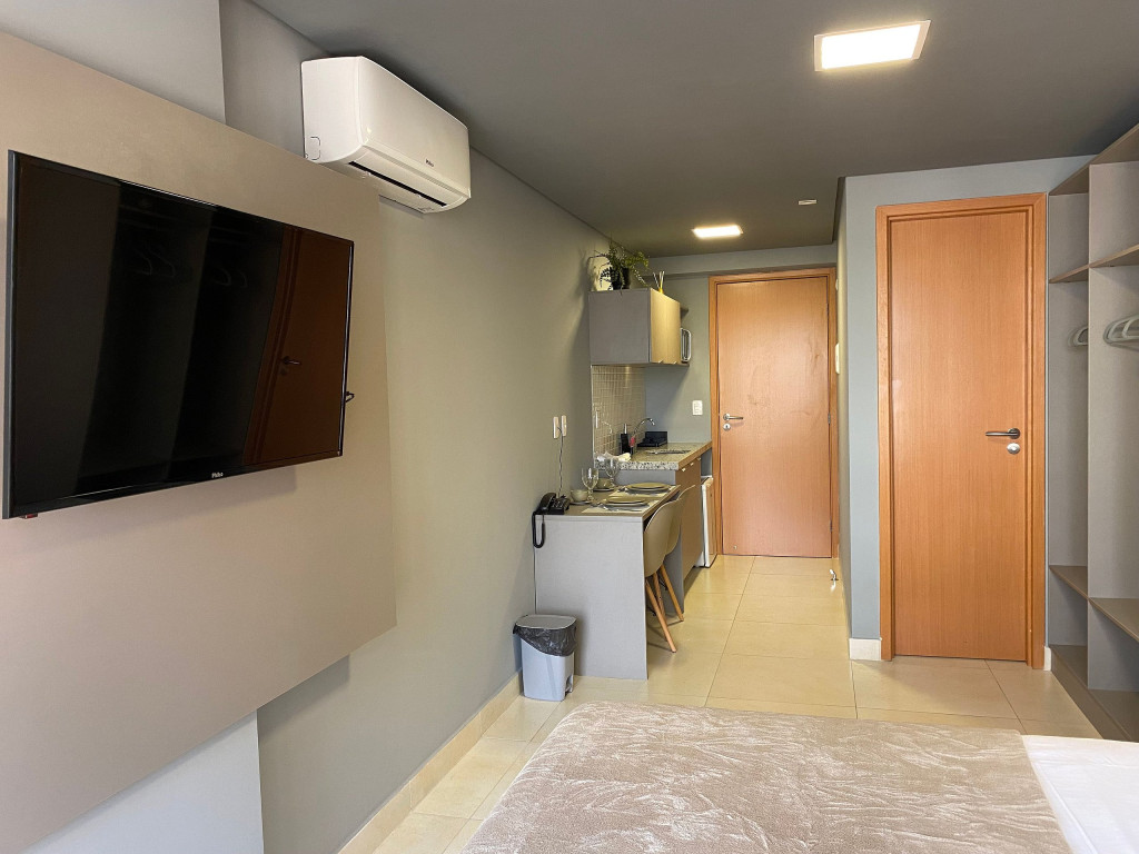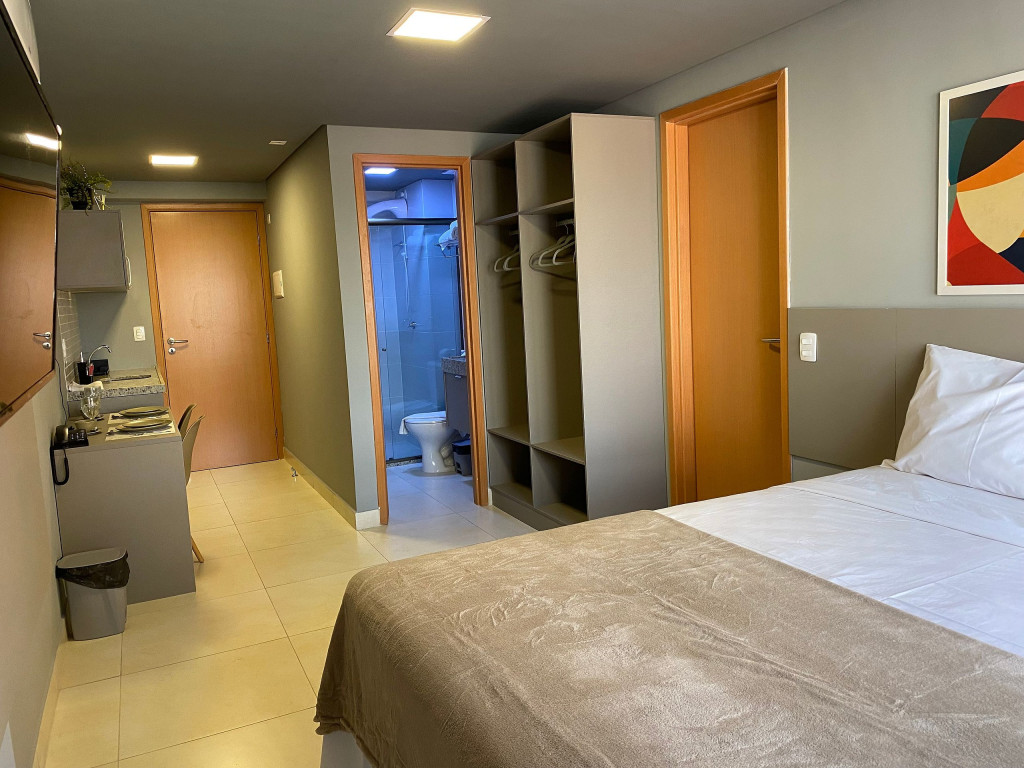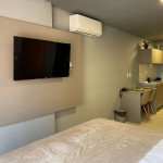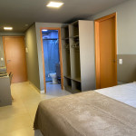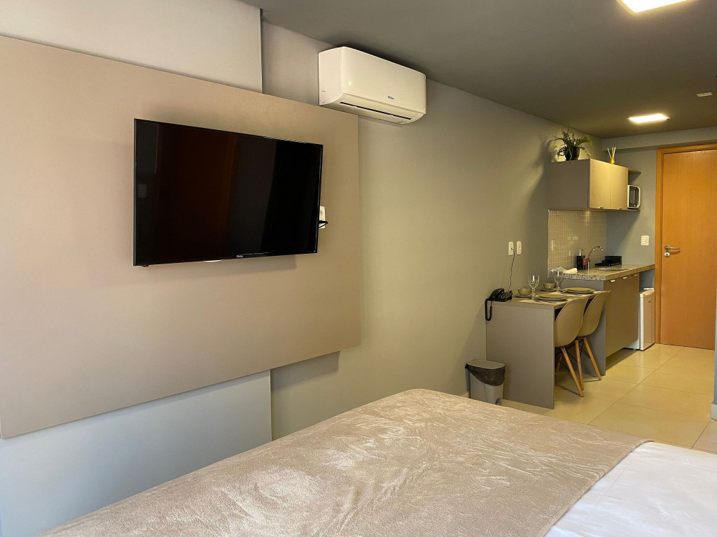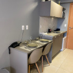 O studio é mobiliado e equipado com microondas, frigobar e cafeteira de cápsula , além de dispor de enxoval como lençóis, toalhas e travesseiros para a sua entrada.
