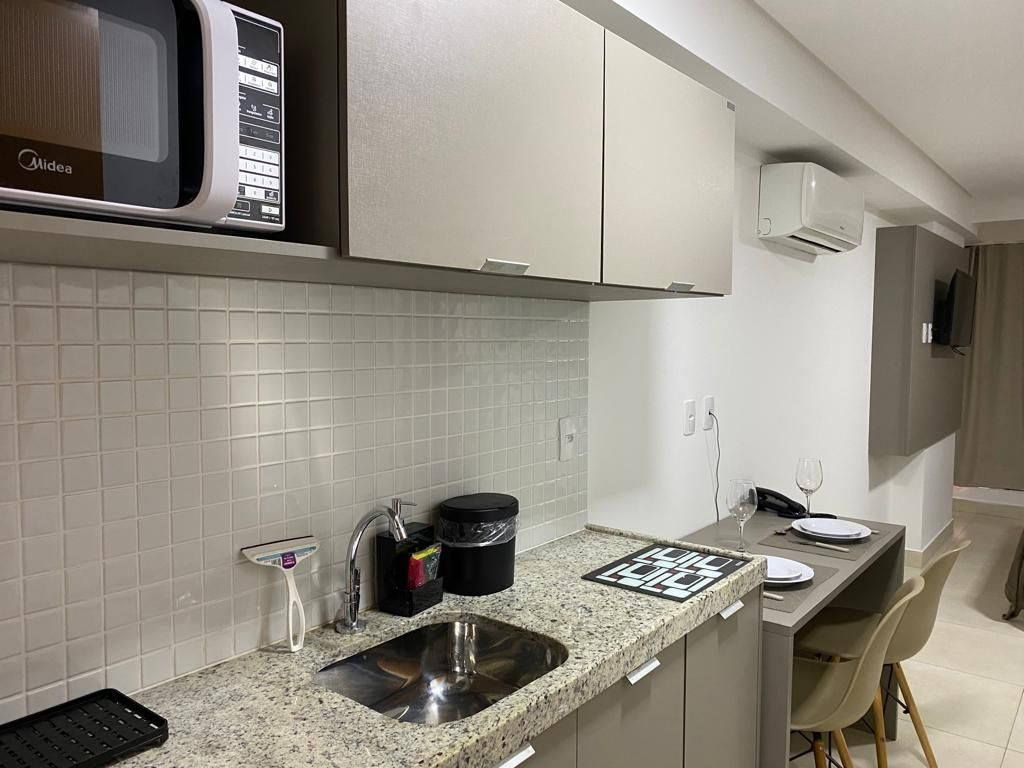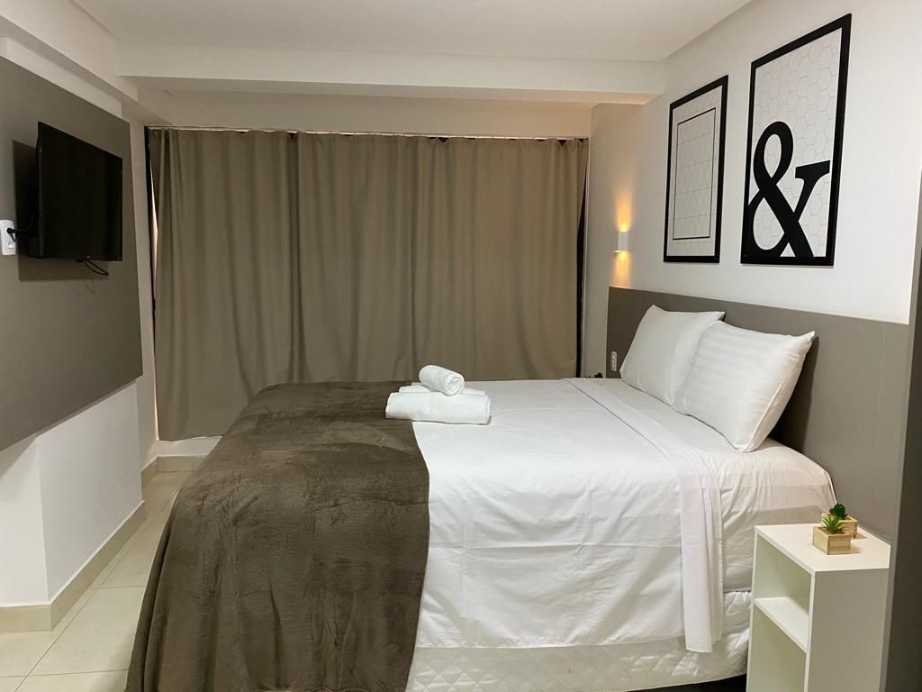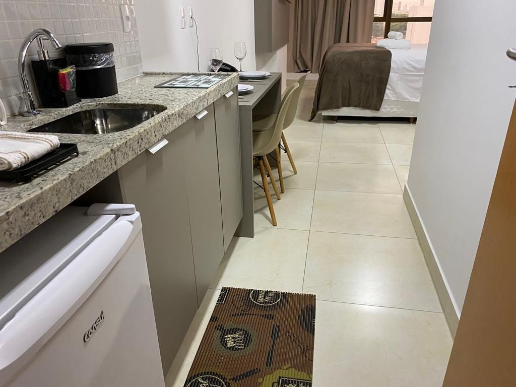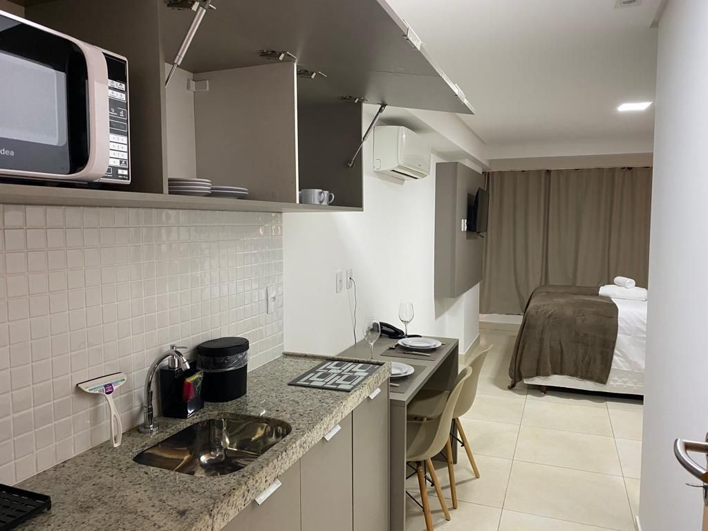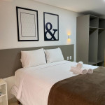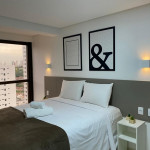 O studio é mobiliado e equipado com microondas, frigobar, cafeteira, liquidificador, louças e talheres , além de dispor de enxoval como lençóis, toalhas e travesseiros para a sua entrada.