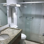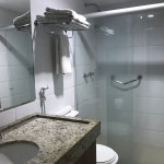 Banheiro com secador de cabelos, espelho, chuveiro de água quente, box de vidro, ducha higiênica.