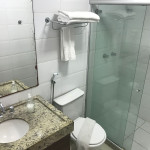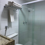 Banheiro com secador de cabelos, espelho, chuveiro de água quente, box de vidro, ducha higiênica.