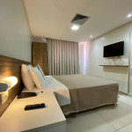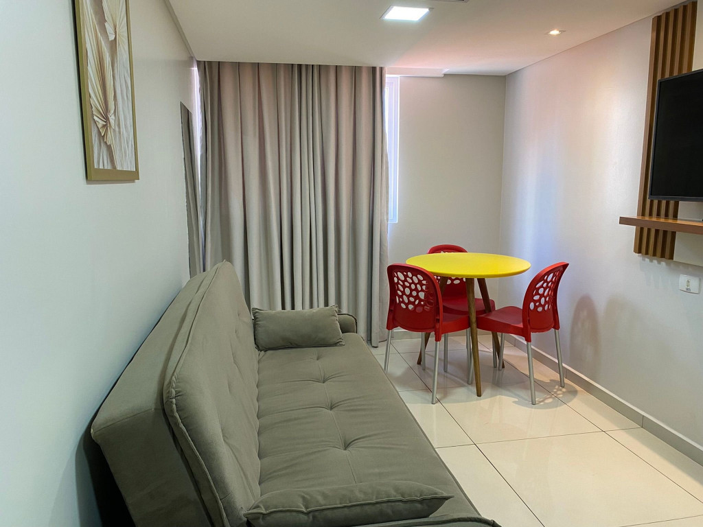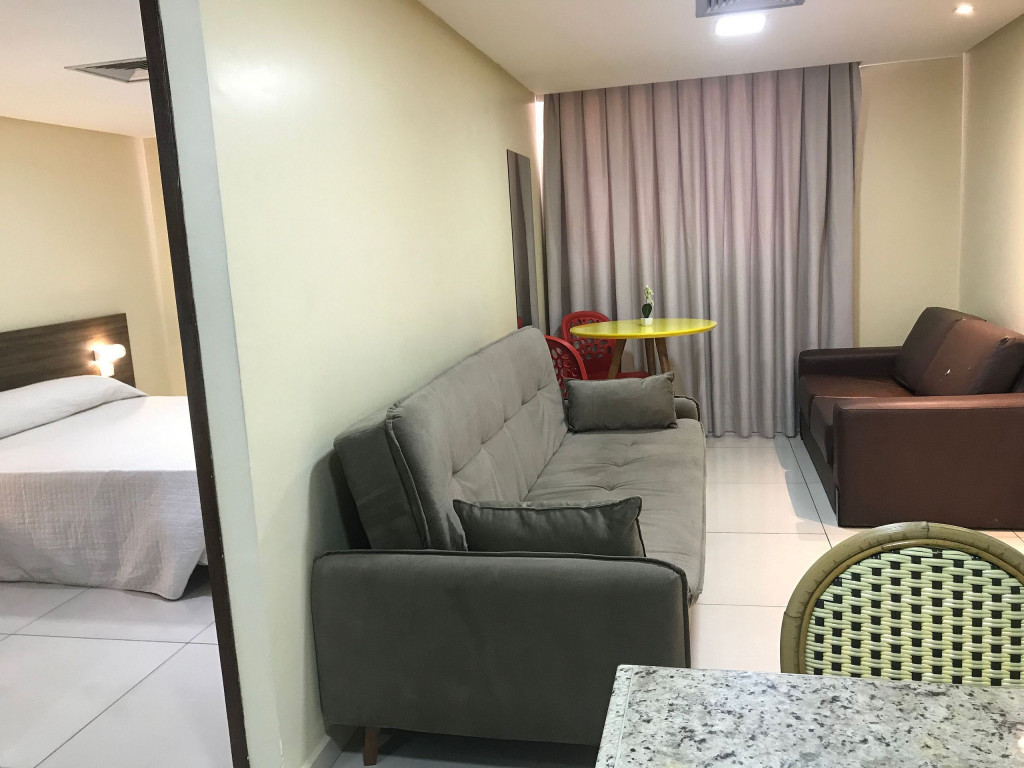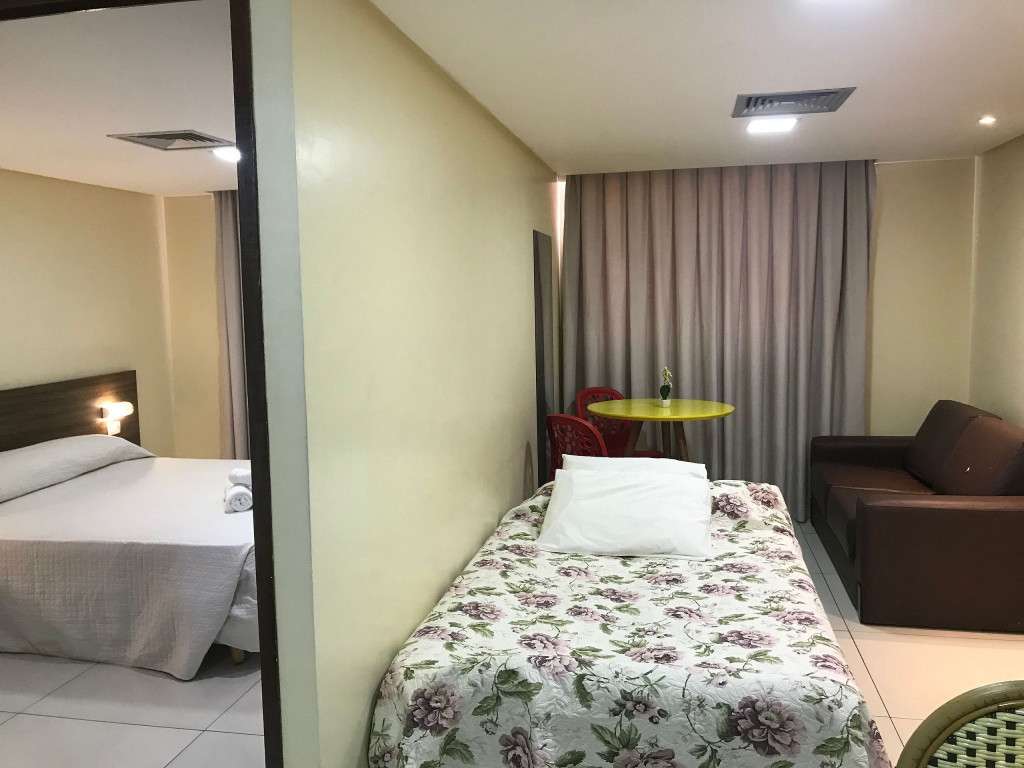 Amplo flat, com porta divisória, possui 01 cama casal+01 sofá cama, oferece acomodações para até 04 pessoas.Possui smart TV, ar-condicionado central, cozinha compacta com eletrodomésticos e utensílios básicos (ideal para preparar pequenas refeições), closet com cabides, mesa de cabeceira, mesa de trabalho com cadeira.