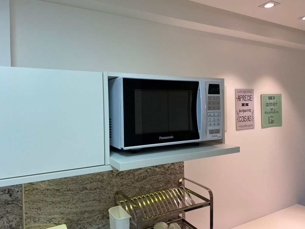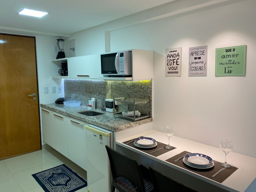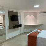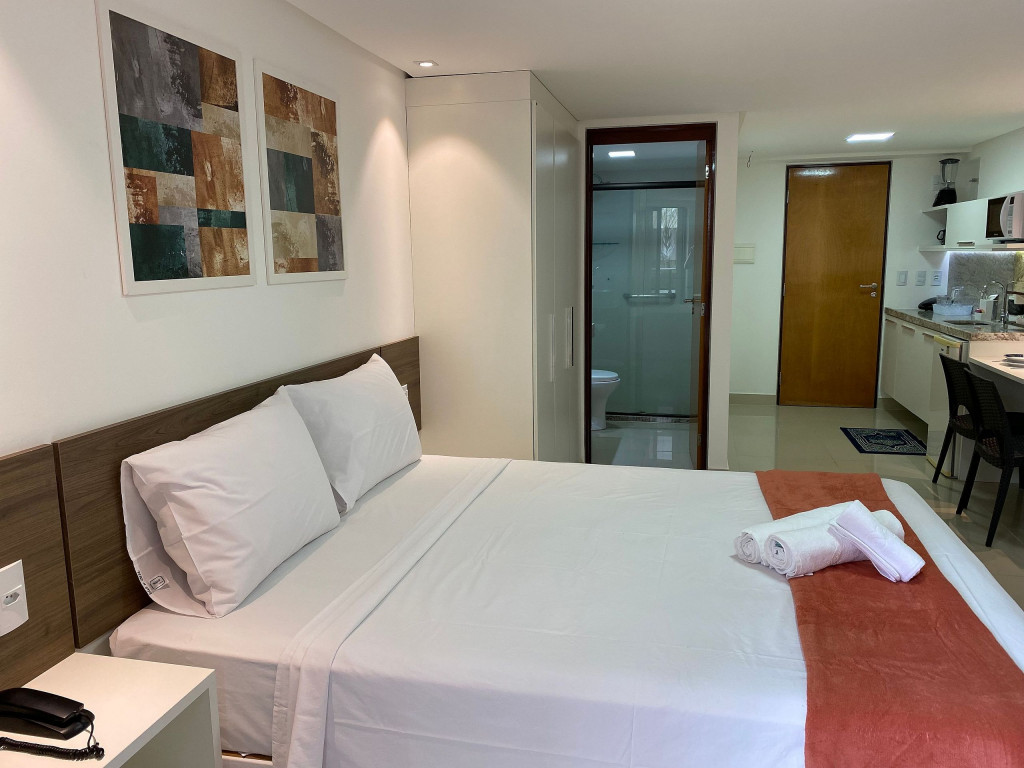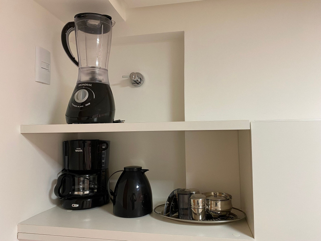 O studio é mobiliado e equipado com microondas, frigobar, cafeteira, liquidificador, louças e talheres , além de dispor de enxoval como lençóis, toalhas e travesseiros para a sua entrada.