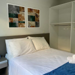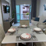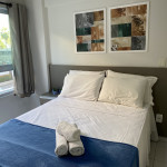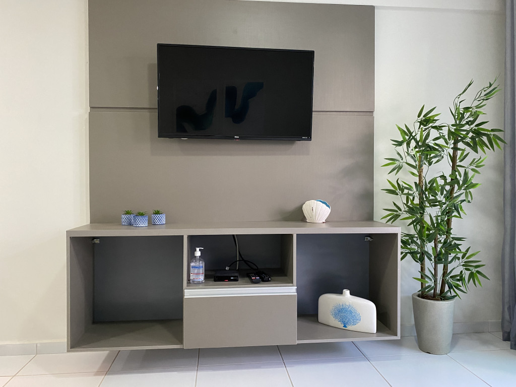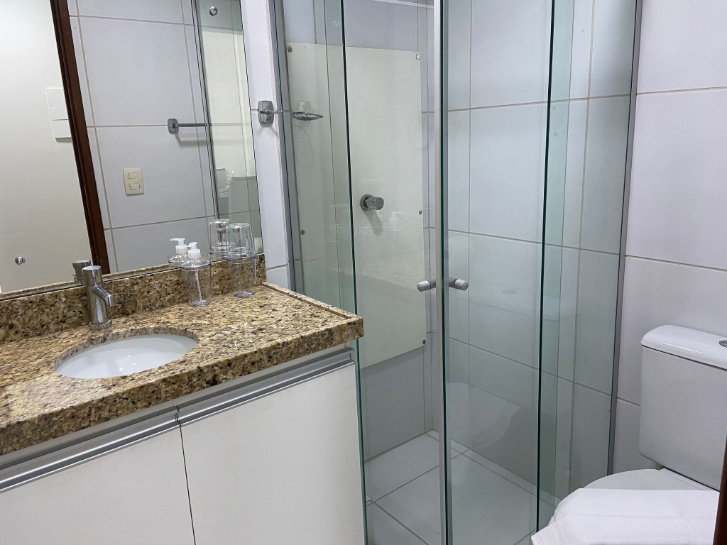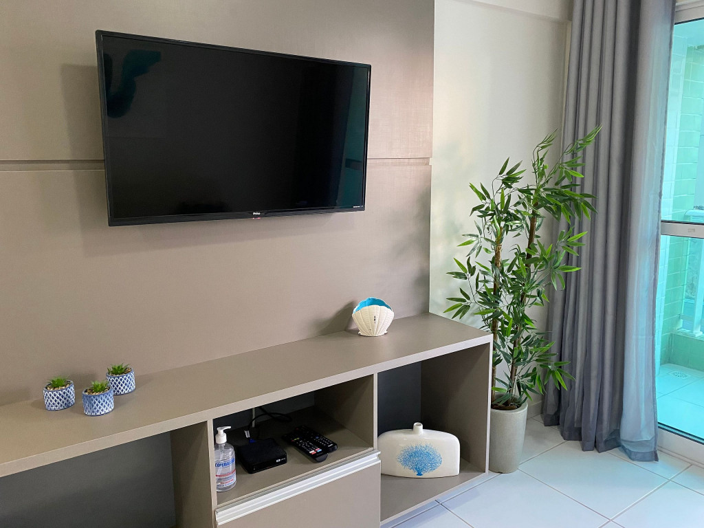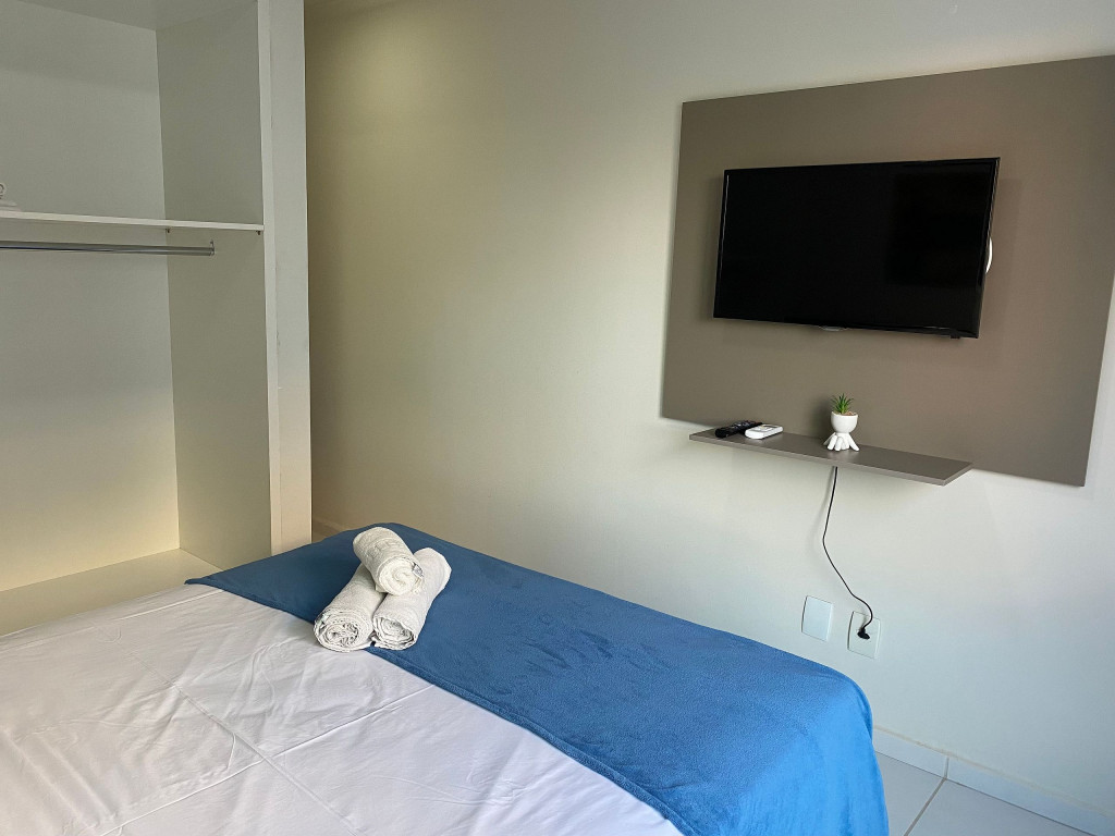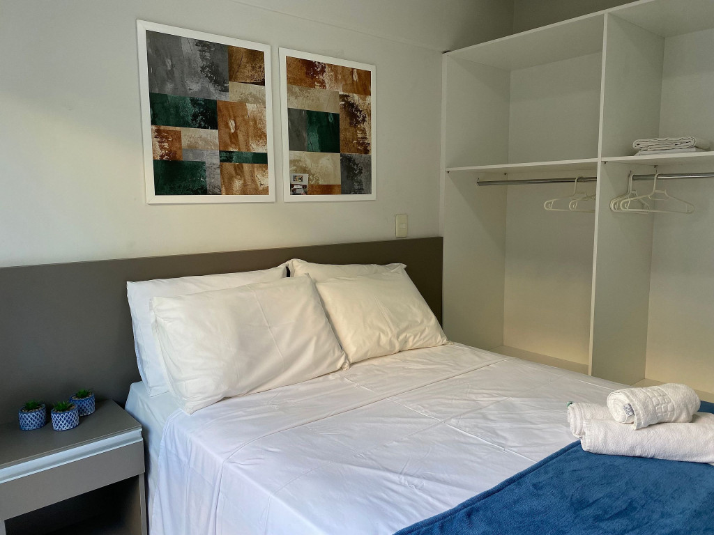 O flat é mobiliado, decorado e equipado com eletrodomésticos utensílios para preparo de refeições, além de dispor de enxoval completo de lençóis, toalhas e travesseiros para a sua entrada.O prédio conta com área de lazer com piscina e possui academia.