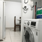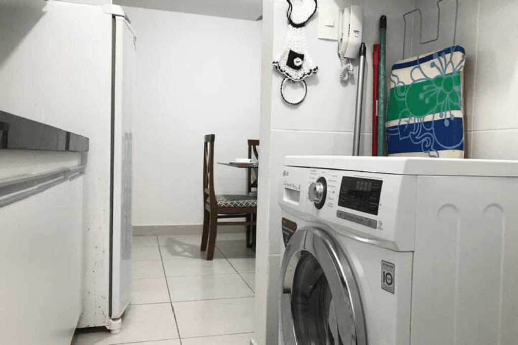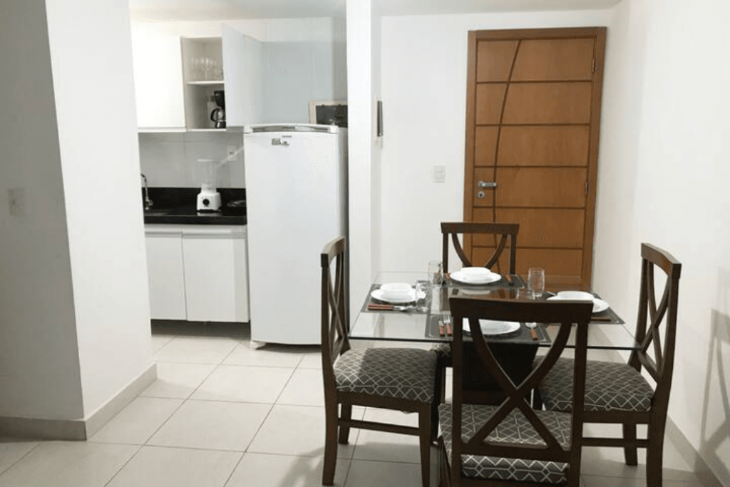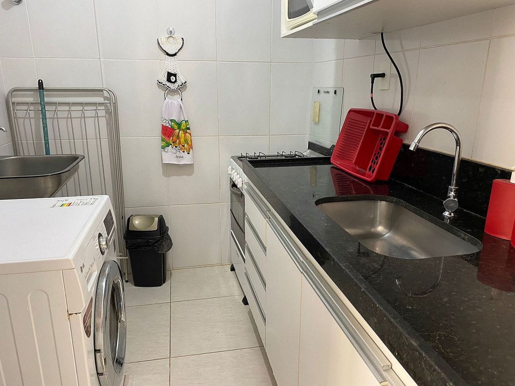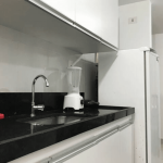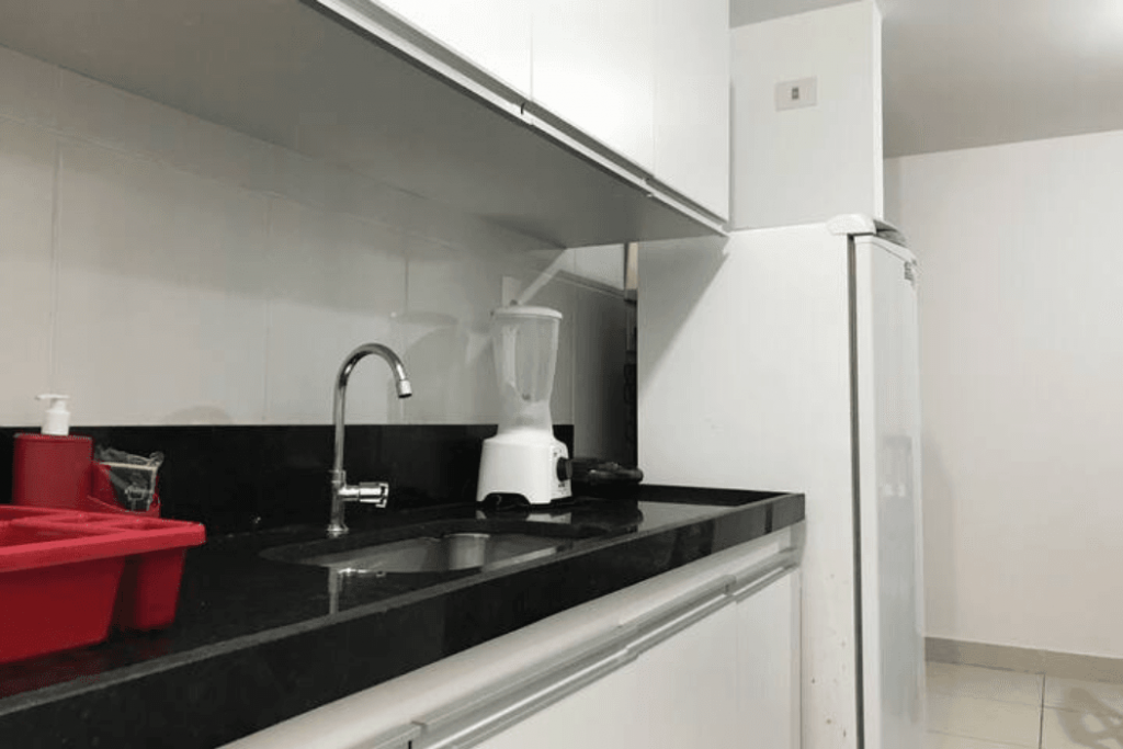 Cozinha equipada com os principais eletrodomésticos: fogão, geladeira, microondas, liquidificador, cafeteira e etc.