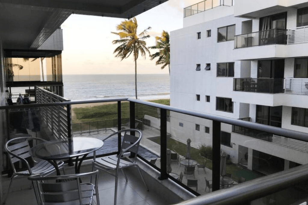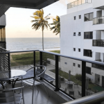 Varanda com vista para a praia e para a piscina do prédio.