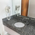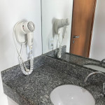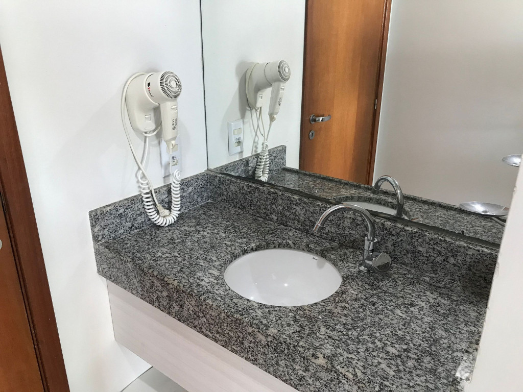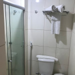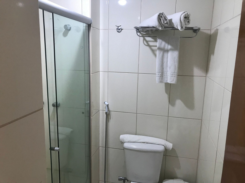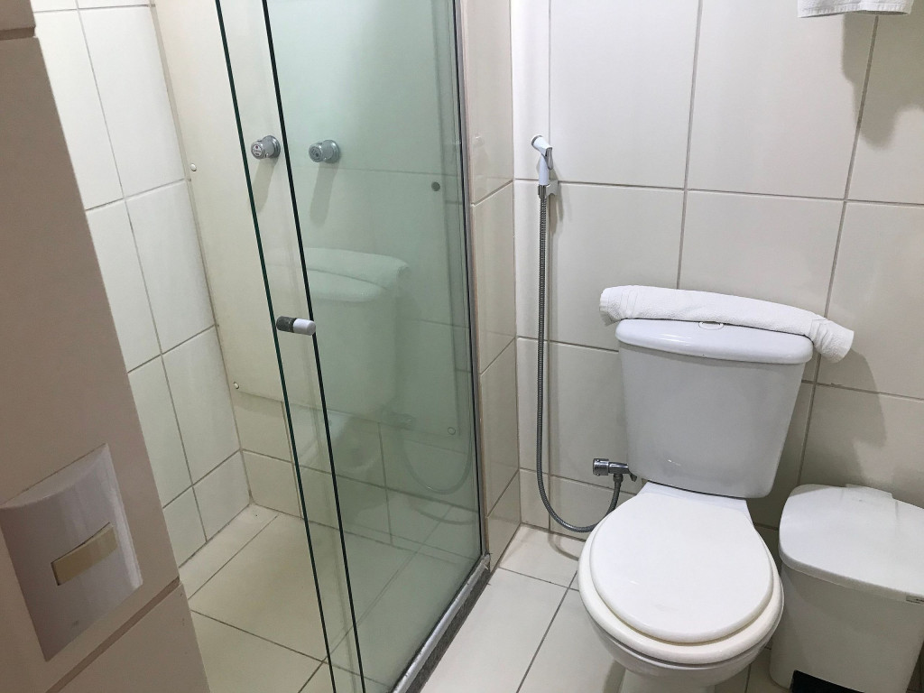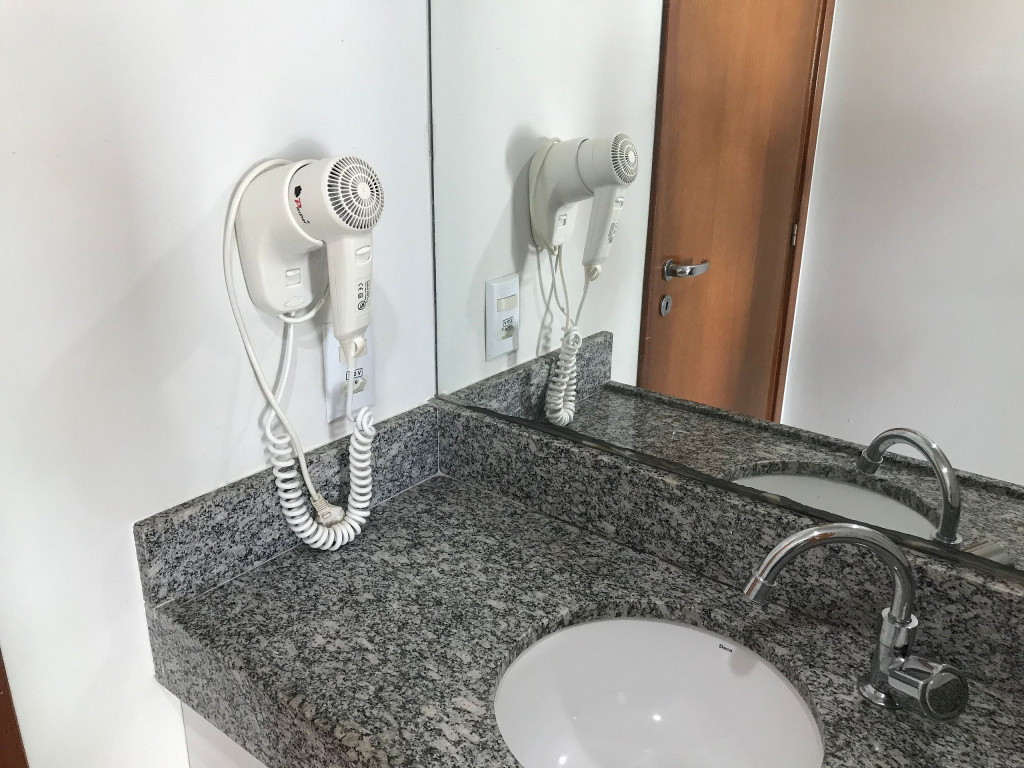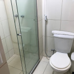 Banheiro com box de vidro, chuveiro com água quente, ducha e secador de cabelos.