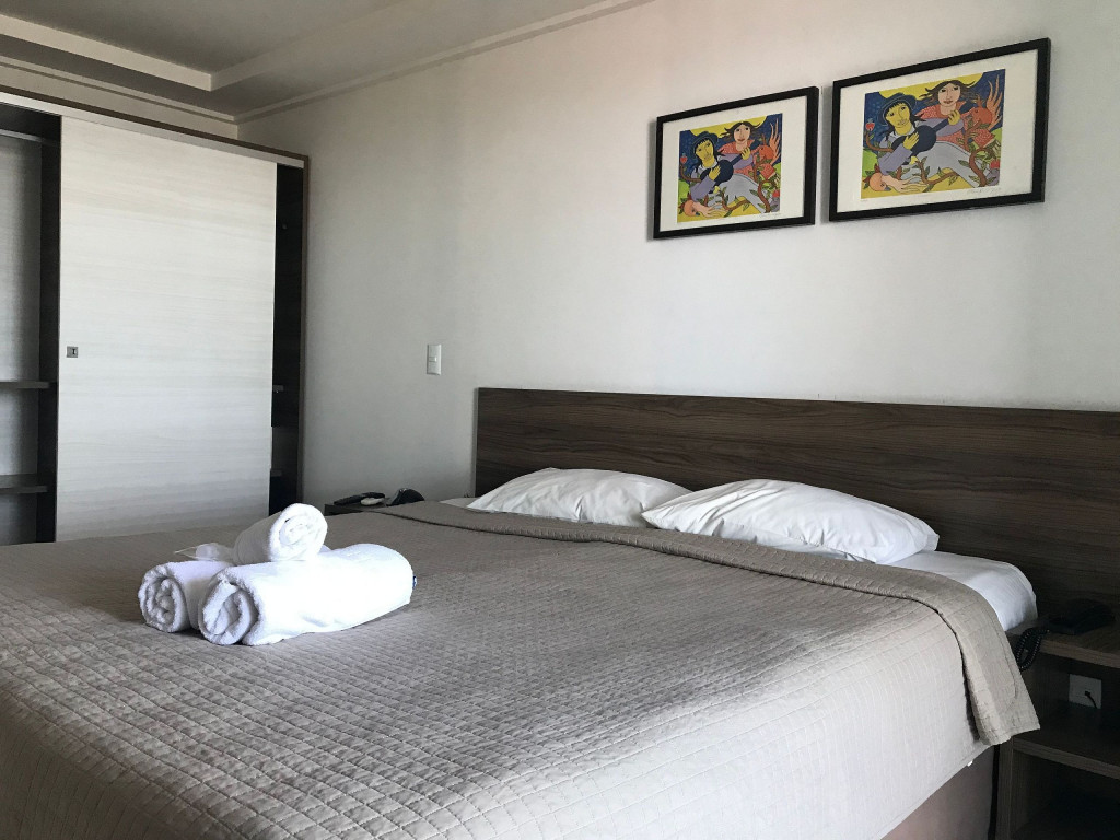 Quarto com cama casal, cofre, tv a cabo, wifi gratuita, ar condicionado split, espelho de corpo inteiro, armário com cabides, cortina com black out e mesinhas de cabeceira.