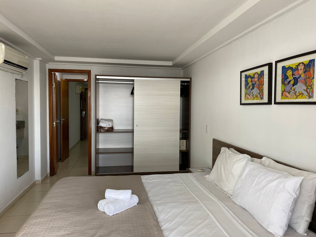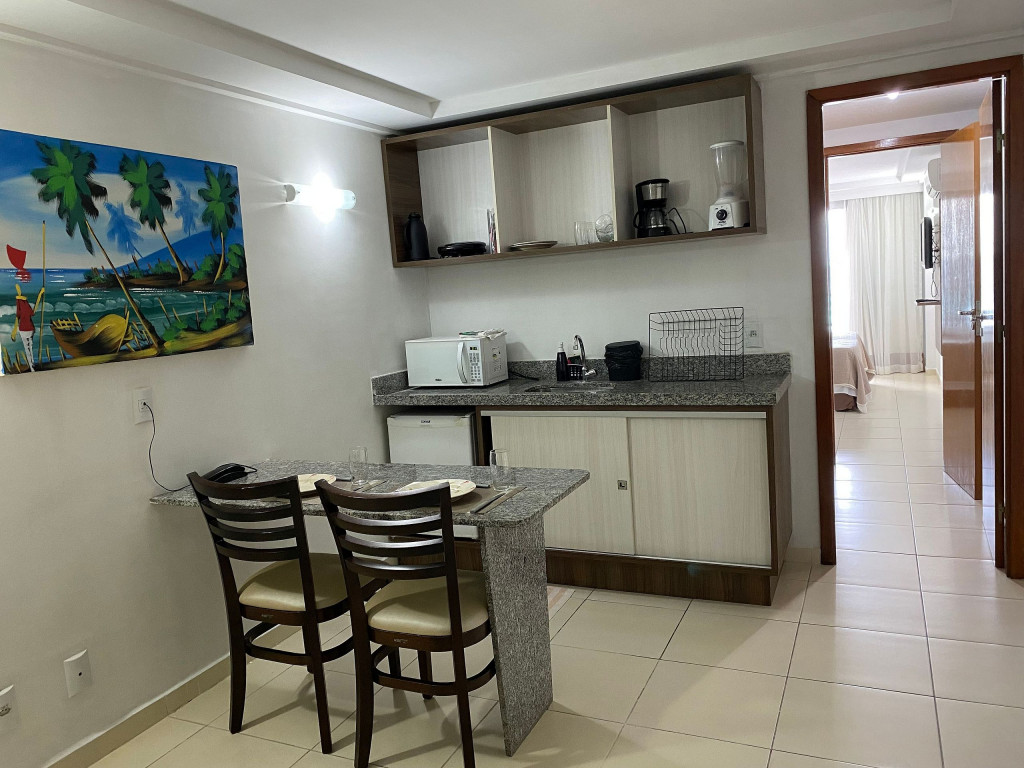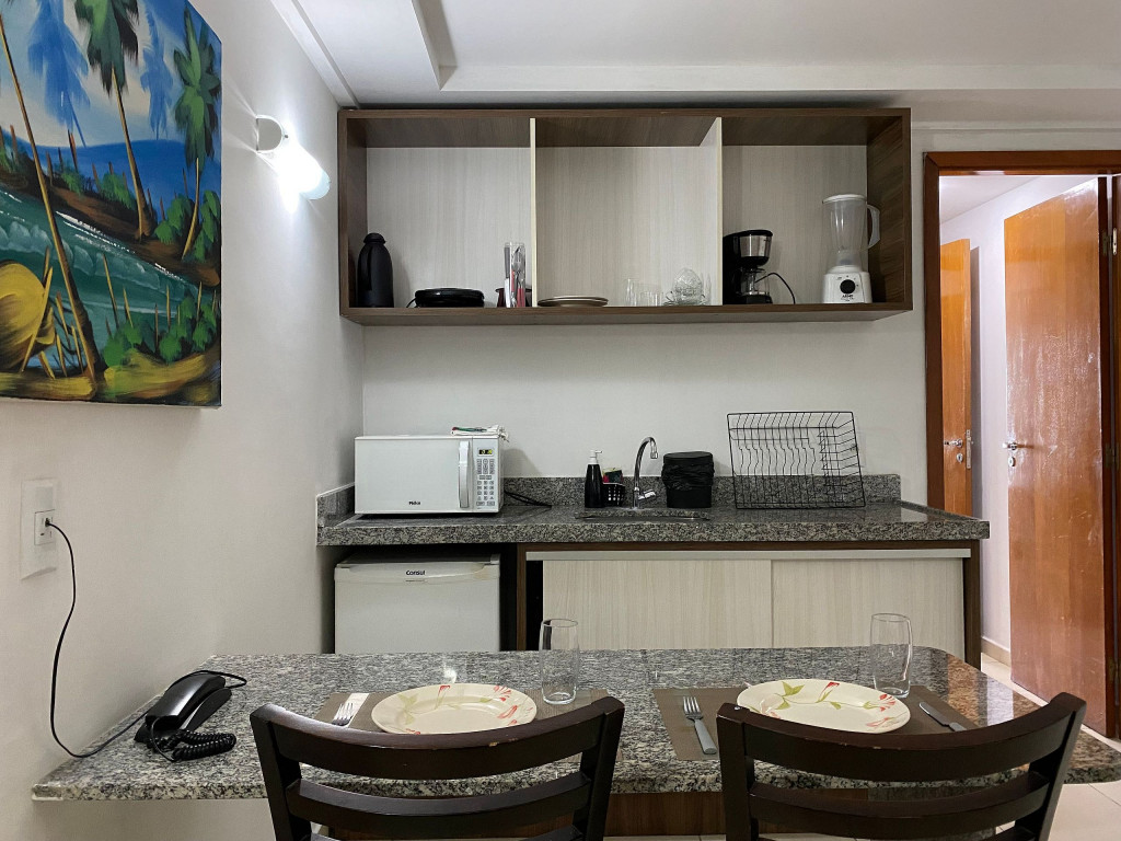 O flat é mobiliado, decorado e equipado com eletrodomésticos utensílios para preparo de refeições, além de dispor de enxoval completo de lençóis, toalhas e travesseiros para a sua entrada.