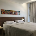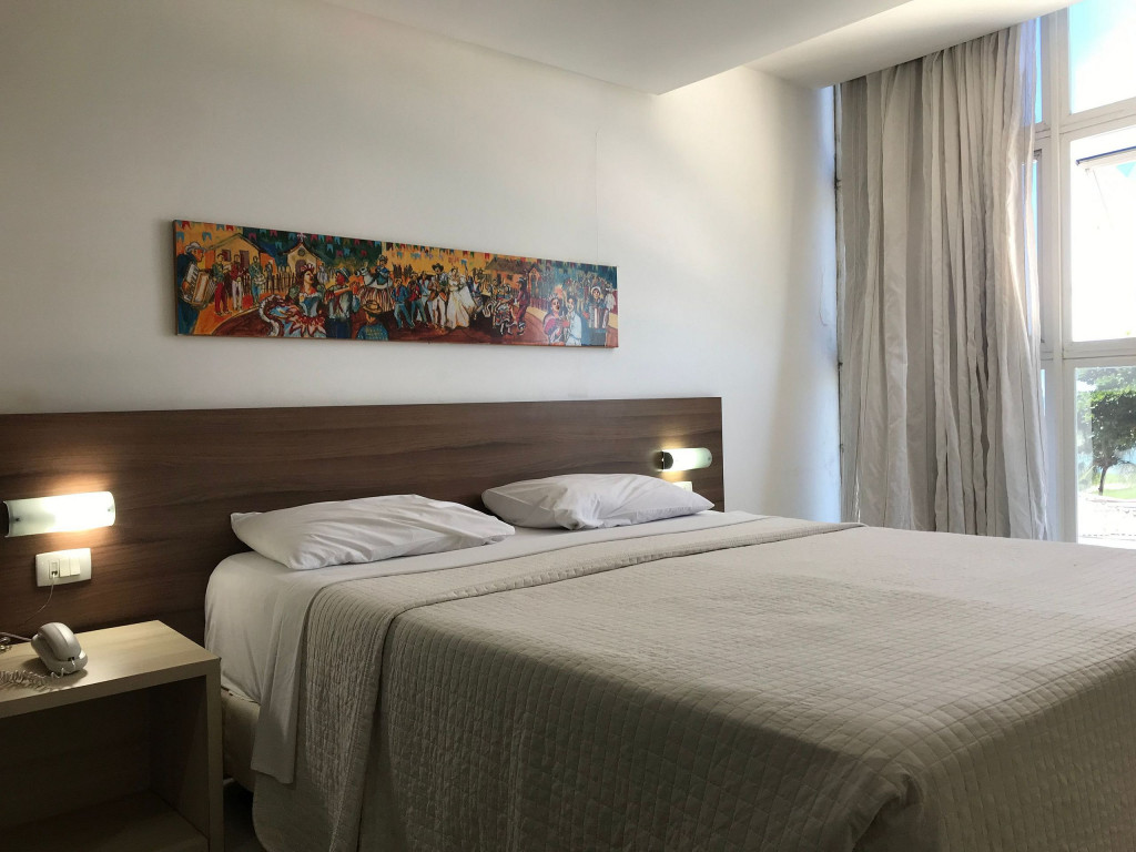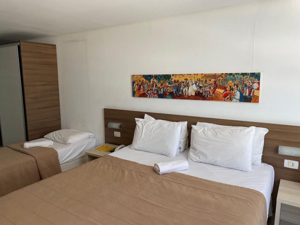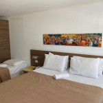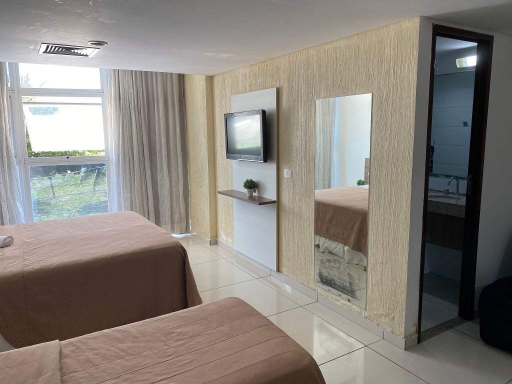 Suíte ampla e confortável, frente mar, oferece acomodações para até 04 pessoas.Possui 01 cama casal, 01 cama solteiro+01 colchão extra, tv tela plana, ar-condicionado central, cozinha compacta com eletrodomésticos e utensílios básicos (ideal para preparar pequenas refeições), closet com cabides, mesa de cabeceira, mesa de trabalho com cadeira.Banheiro com secador de cabelos, chuveiro de água quente, box de vidro, ducha higiênica.