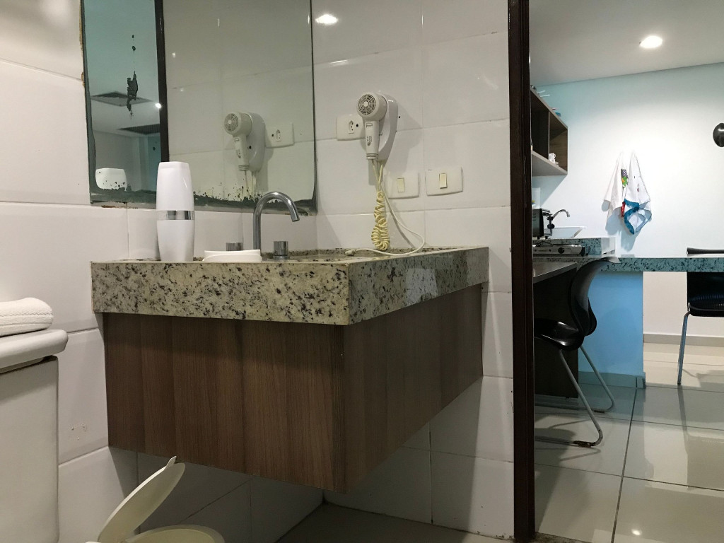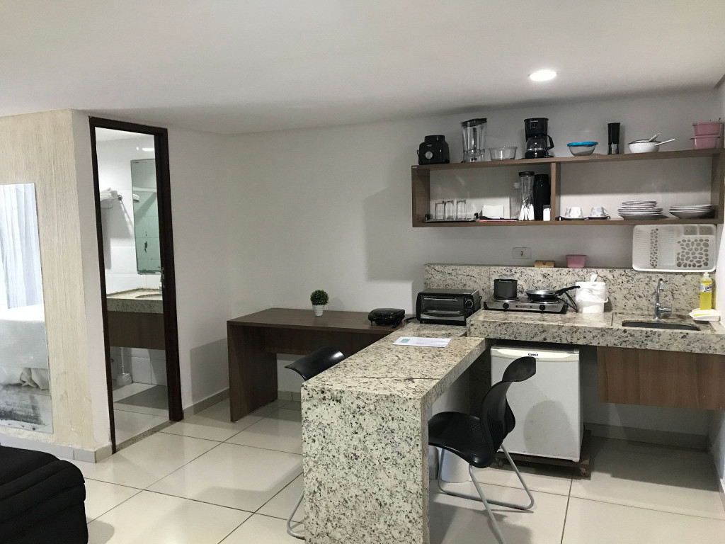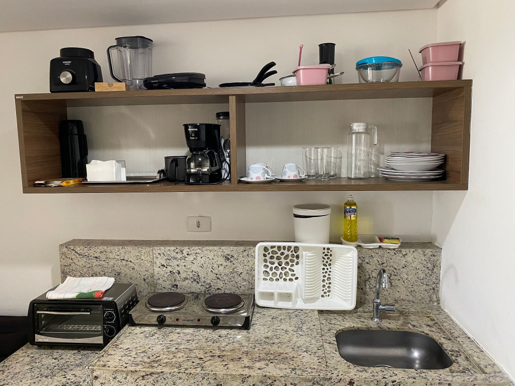 O flat é mobiliado, decorado e equipado com eletrodomésticos e utensílios para preparo de refeições, além de dispor de enxoval completo de lençóis, toalhas e travesseiros para a sua entrada.