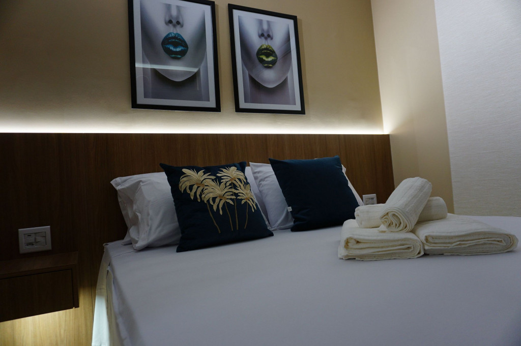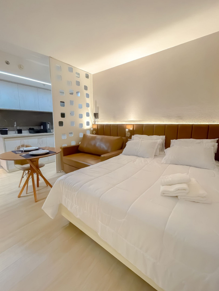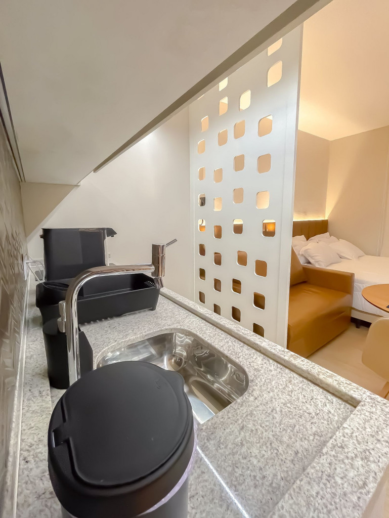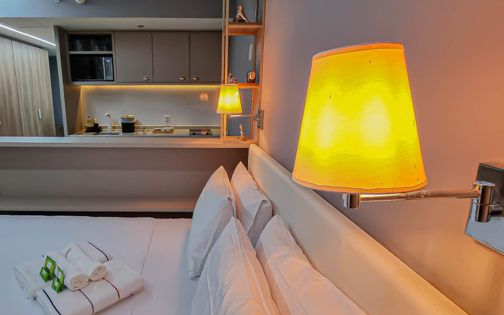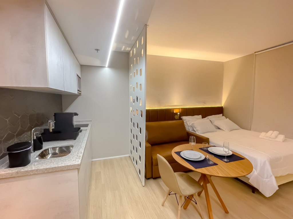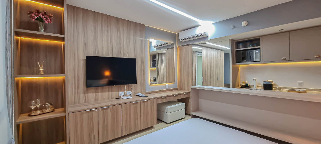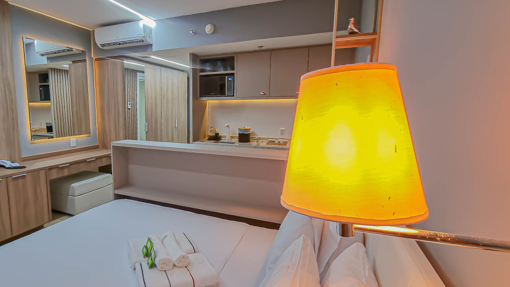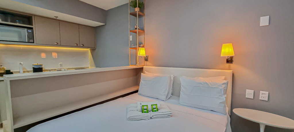 Totalmente exclusivo ao hóspede, o studio conta com Smartv, ar condicionado. Cozinha repleta em armários, diversos utensílios como: pratos, taças para vinho, copos, panelas, talheres, garrafa para café e sanduicheira. Cama de casal, roupa de cama premium, travesseiros e guarda-roupa. Banheiro com toalhas, sabonete e papel higiênico. Áreas em comum do condomínio estão sujeitas a agendamento na portaria (Lavanderia, Academia, Salão de jogos, Área de Churrasco).