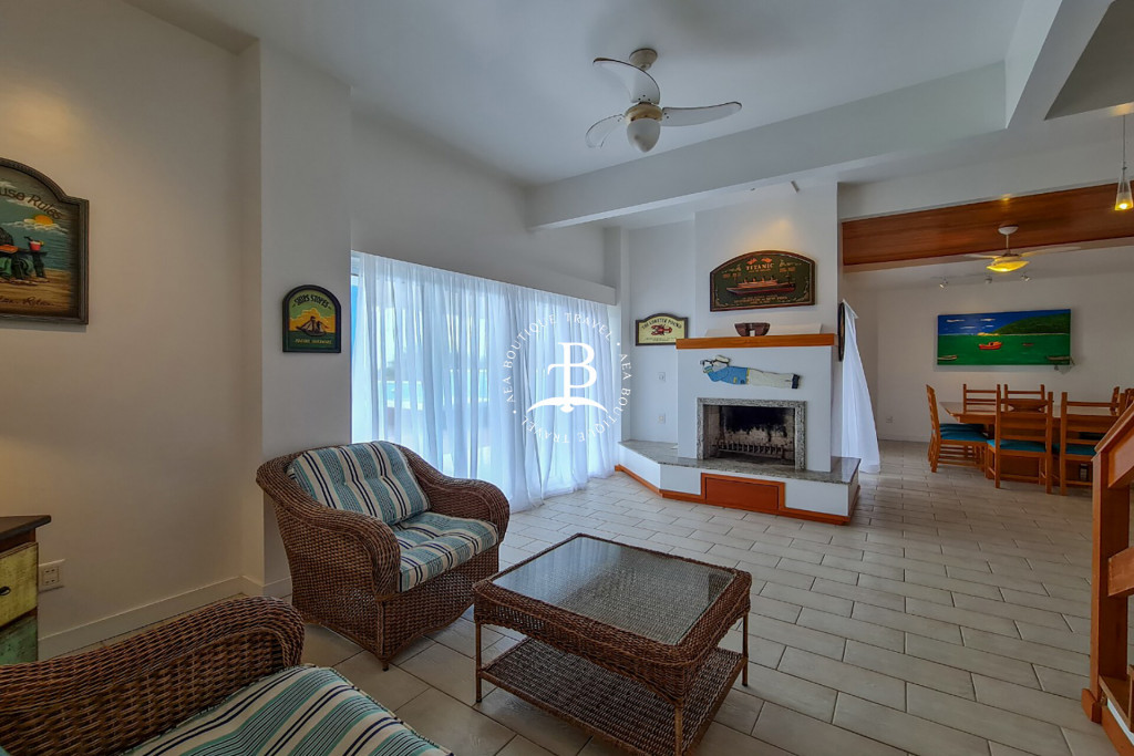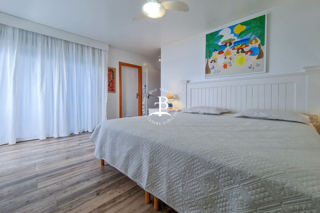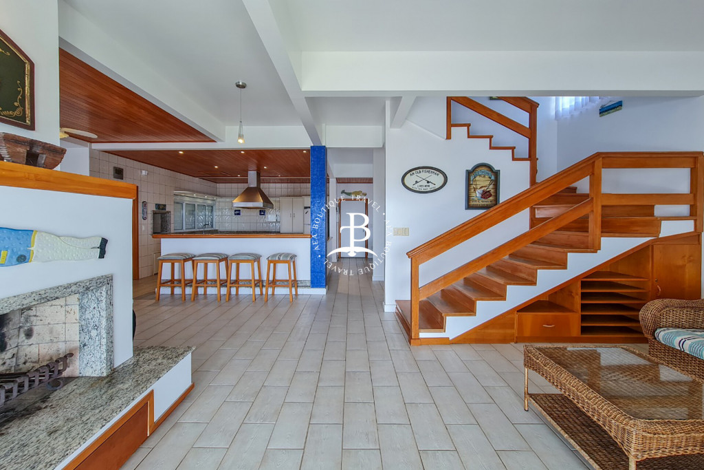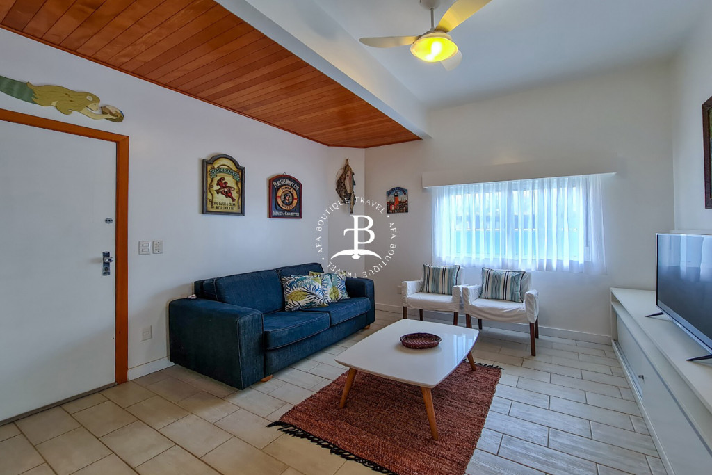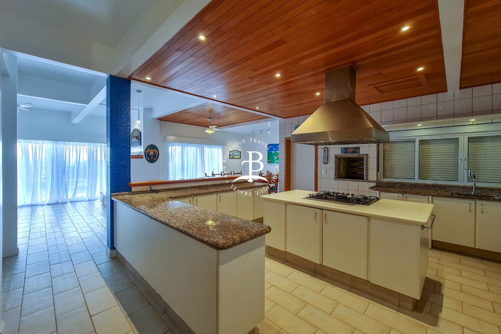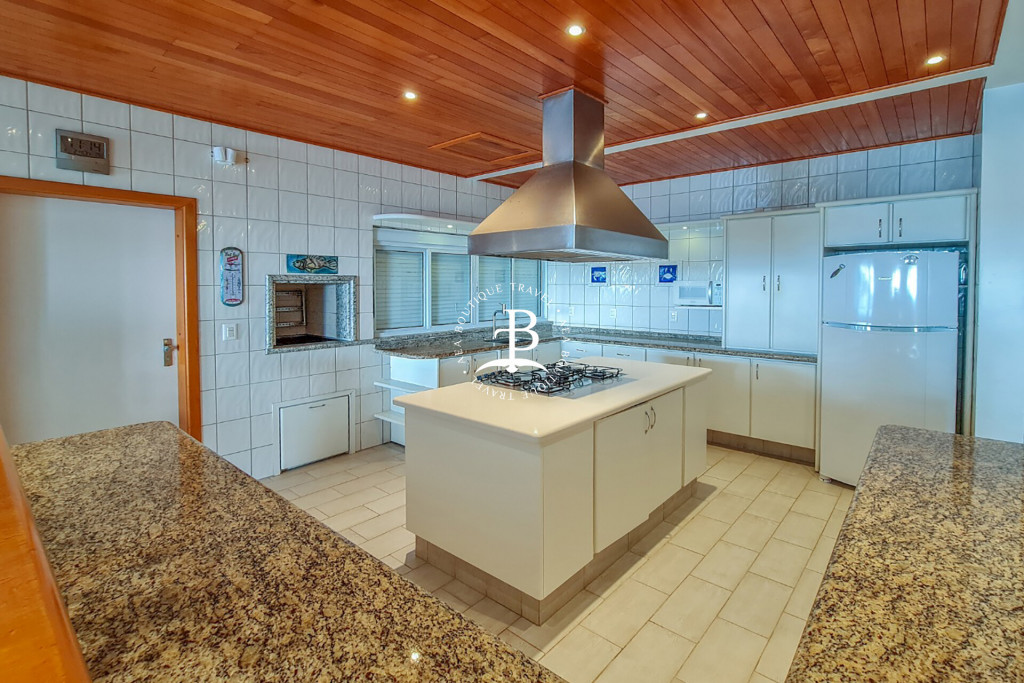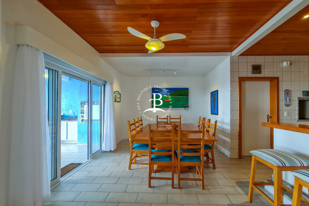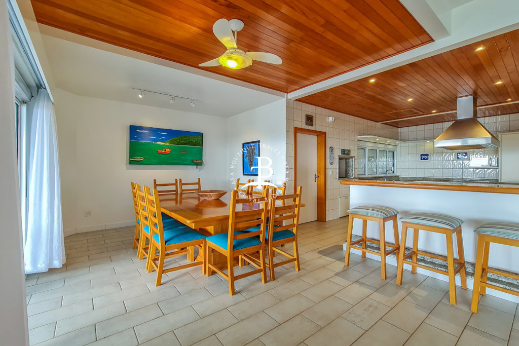 A sala de estar é ampla e, conta com uma linda lareira e vista do mar, dispõe de sala de convivência com TV, está integrada a cozinha no formato Ilha totalmente equipada com área para refeições. Todas as 05 suítes são equipadas com aparelho de ar condicionado, uma suíte ‘máster’ com varanda vista mar. A casa acomoda confortavelmente até 10 convidados!