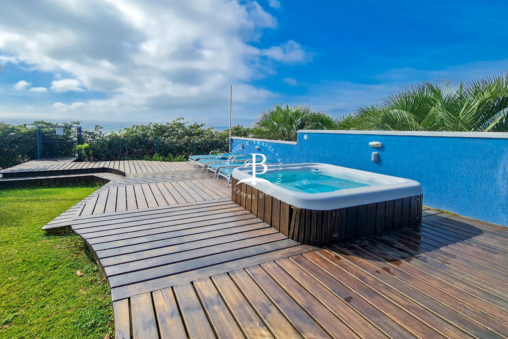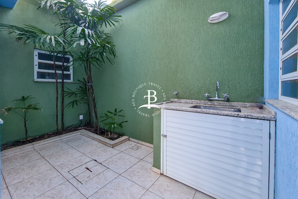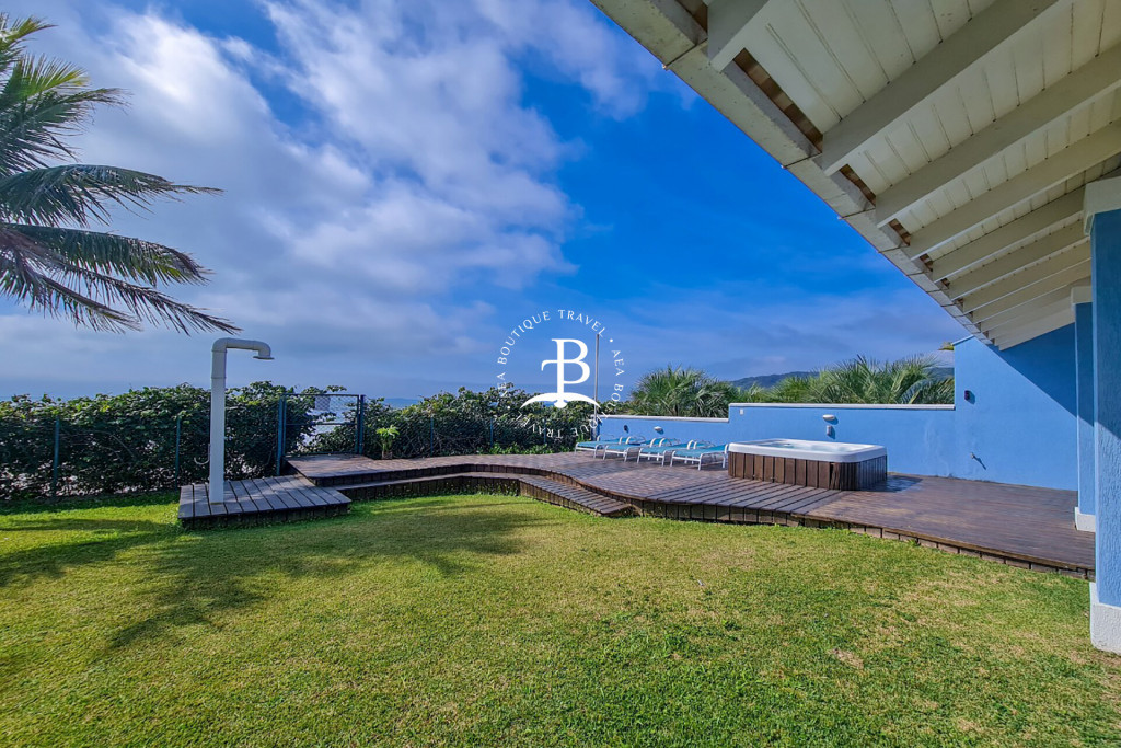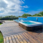 Começando pela área gourmet que fica de frente para o mar, você pode contar com hidromassagem, deck, jardim, ducha, churrasqueira, e redes para relaxar enquanto você e sua família tomam um drink!