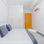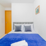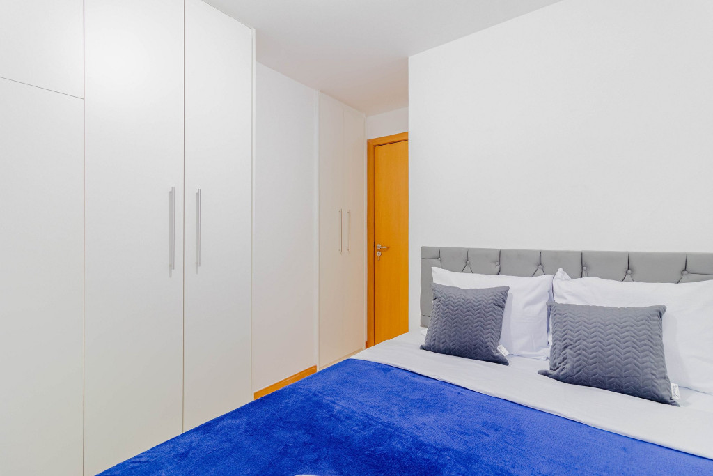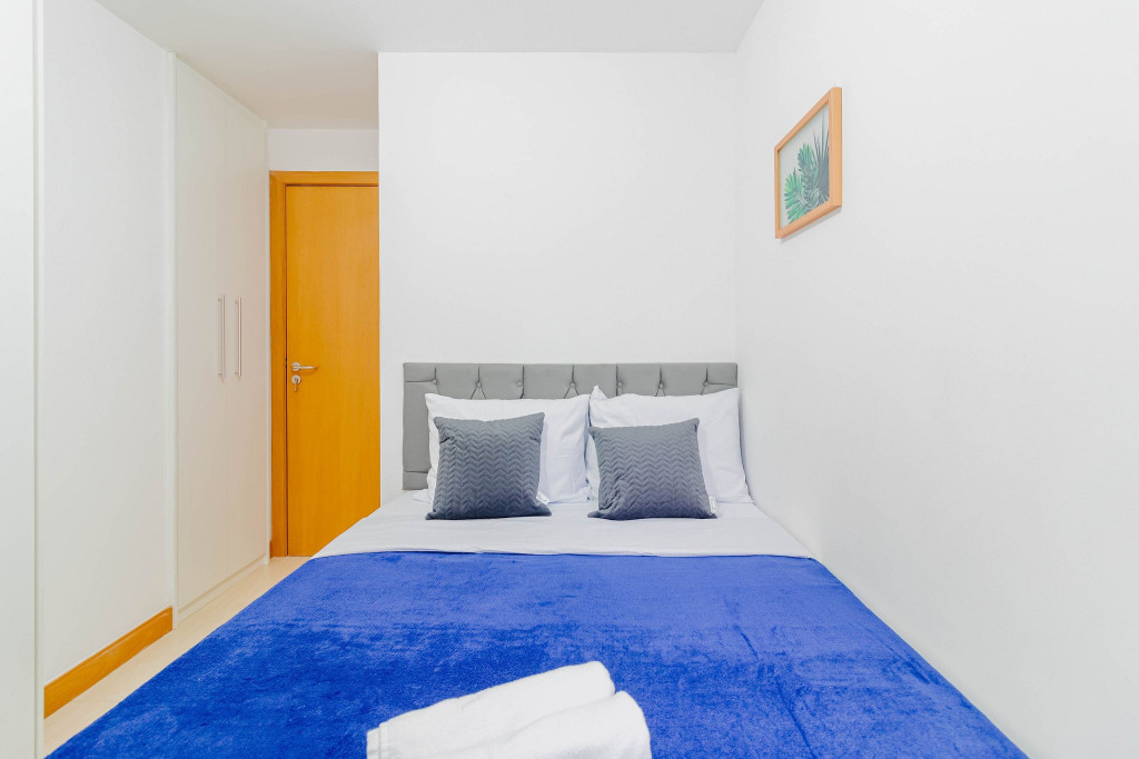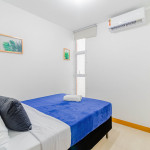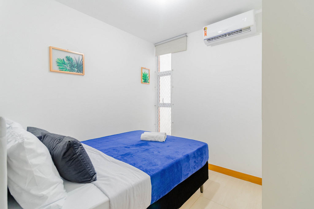 Os quartos são compostos da seguinte forma: Quarto 1: 1 cama casal, 1 colchão solteiro, ar condicionado split, cortina blackout e armário; Quarto 2: 1 cama casal, ar condicionado split, cortina blackout e armário.
