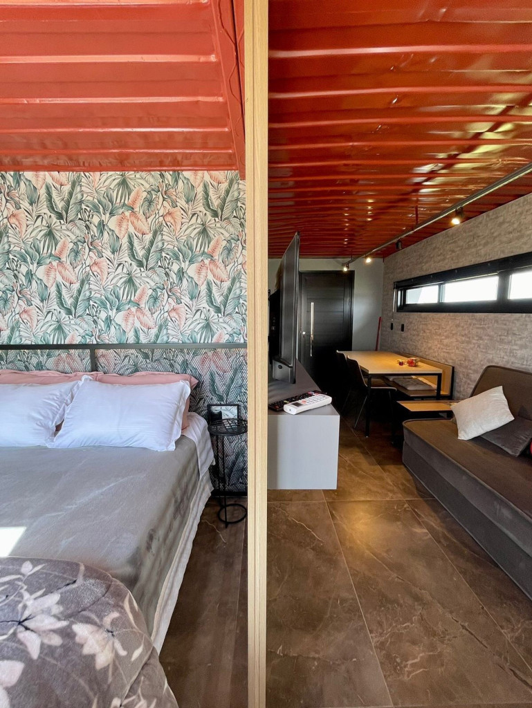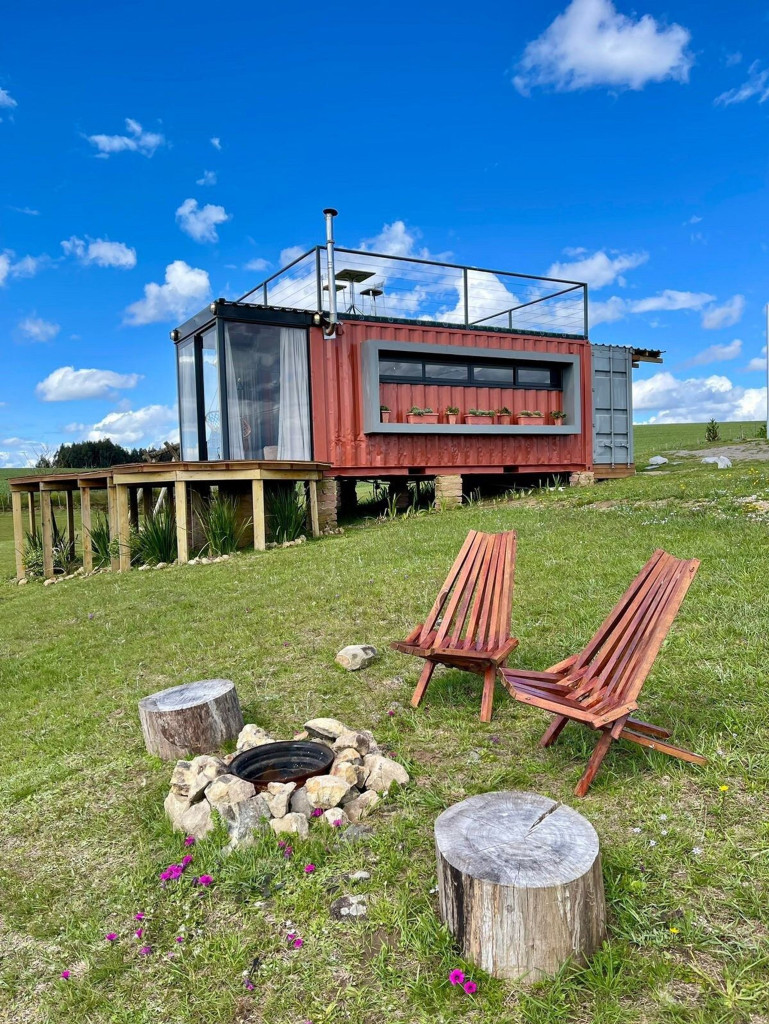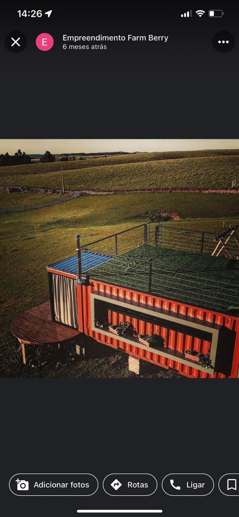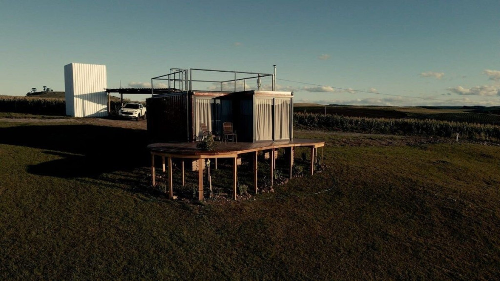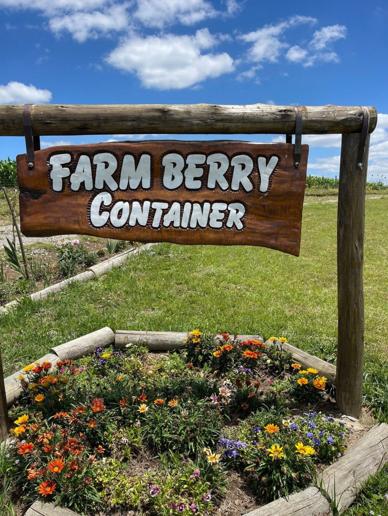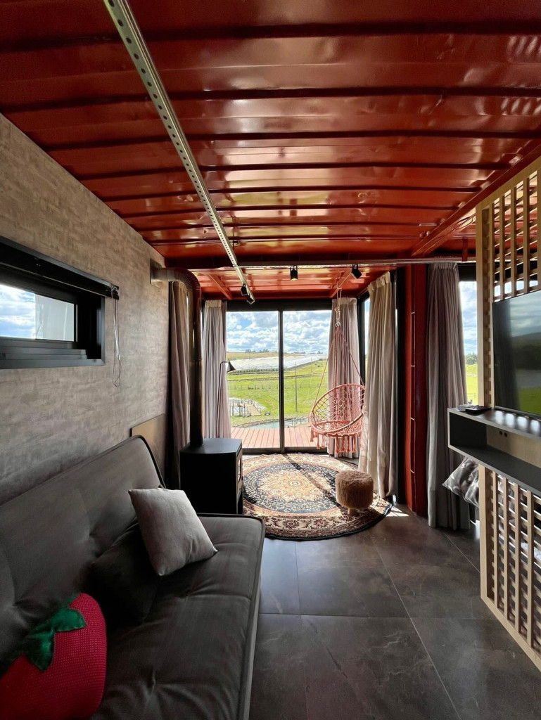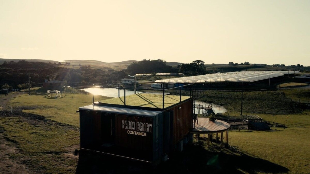 Uma cabana contêiner cuidadosamente criada para lhe receber, dentro de uma impecável fazenda de morangos.