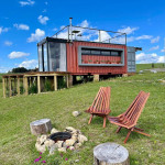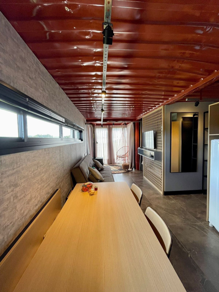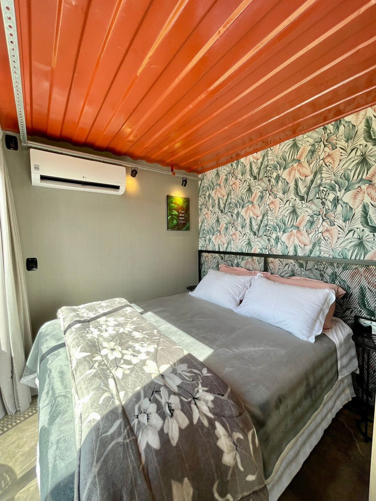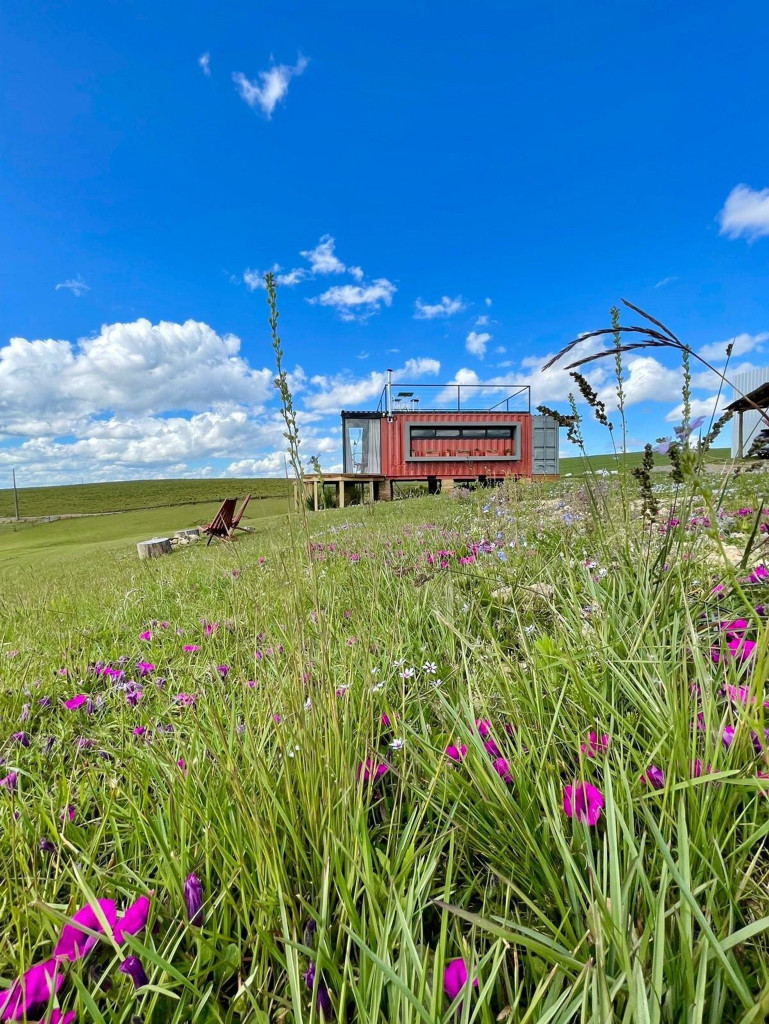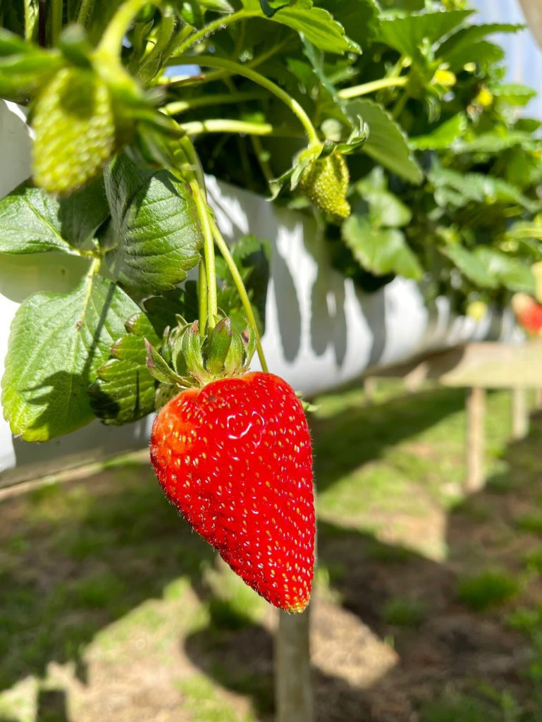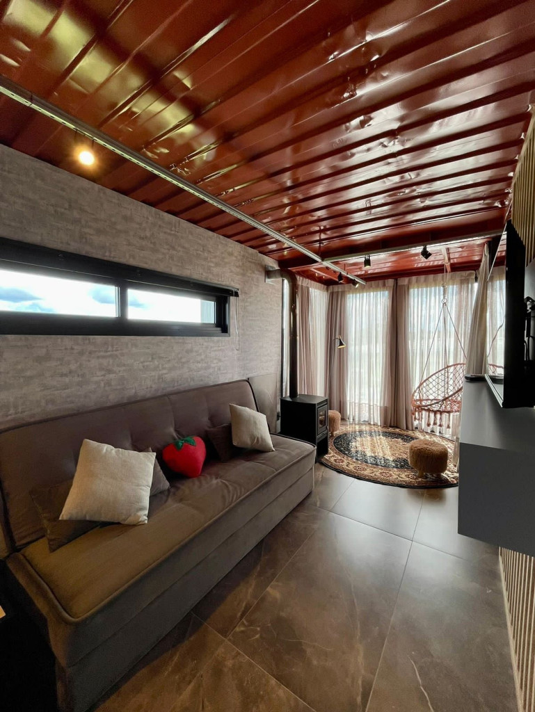 Uma cabana contêiner cuidadosamente criada para lhe receber, dentro de uma impecável fazenda de morangos.