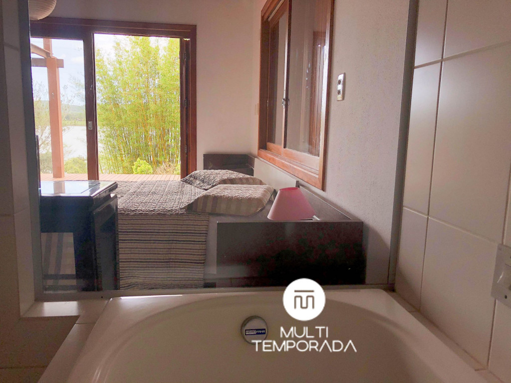 A Cabana oferece duas suítes, uma em piso inferior com uma cama de casal, ar-condicionado e banheira de hidromassagem. A segunda suíte em piso superior, possui dois sofás-camas, ar-condicionado e fica em uma espécie de mezanino com vista direta para a lagoa de ibiraquera, uma experiência incrível. Além disso, a casa dispõem de 1 sacada grande em cima, perfeita para relaxar e uma varanda no piso térreo bem extensa com material feito à madeira e com redes para usufruirem da melhor forma em sua estadia. Ademais, a casa possui cozinha completa com fogão, forno, geladeira, eletrodomésticos de primeira linha e todos os itens básicos de cozinha. Por fim, temos uma área de serviço com máquina de lavar a disposição. Aproveite de um local sossegado para trabalhar home-office, temos WI-FI disponível. Estacionamento coberto!
