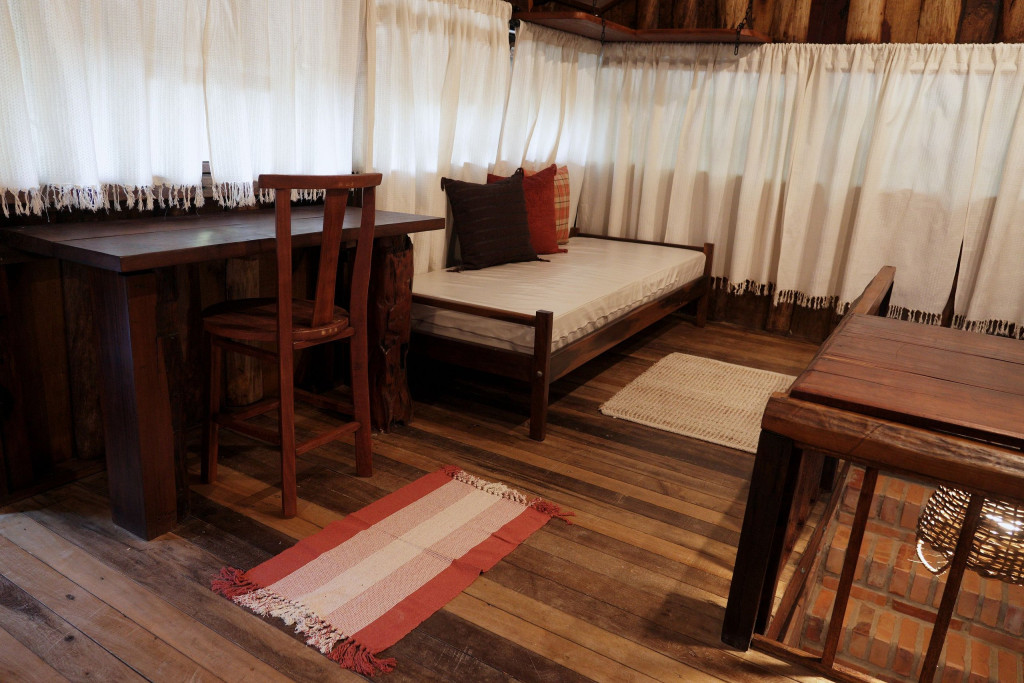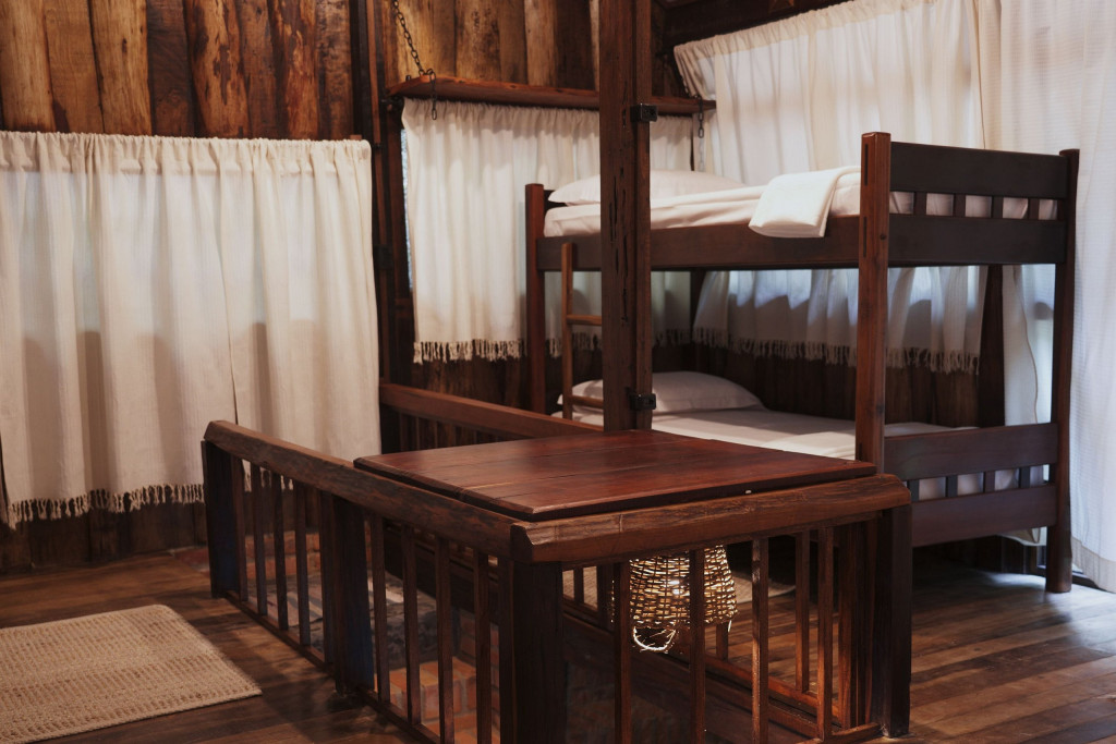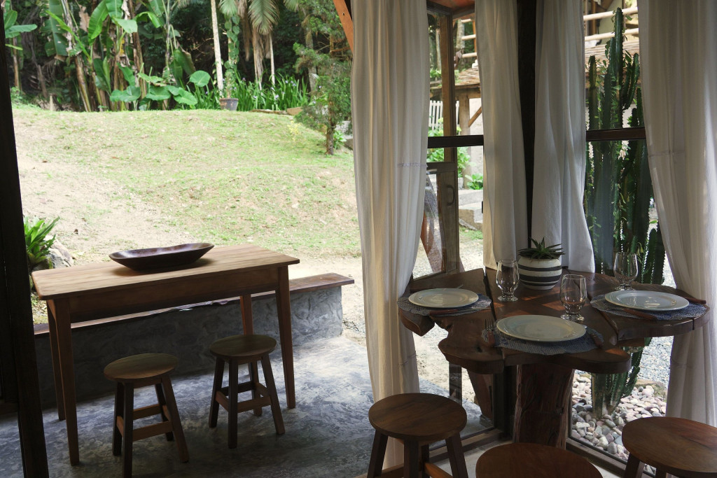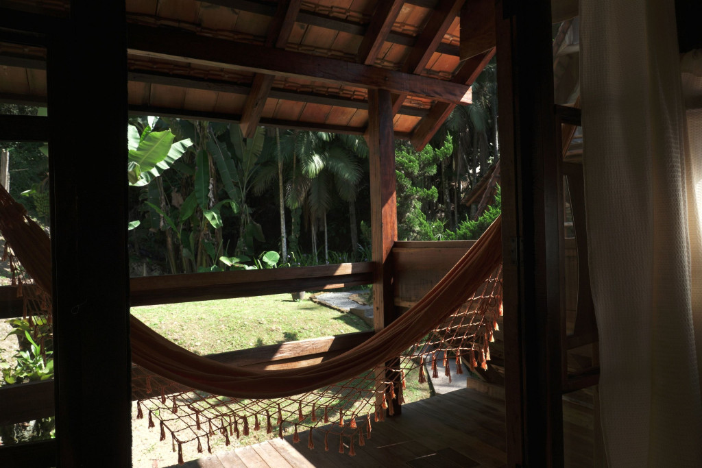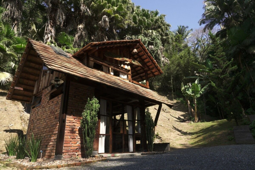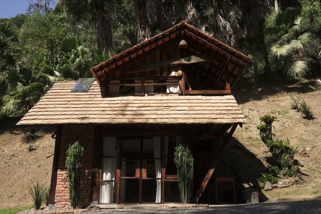 A CABANA, construída com material de demolição, em clássico estilo rústico, forma um aconchegante ambiente de sossego, descanso e confraternização. No térreo, encontram-se a cozinha, completa, o banheiro, em estilo vintage, constituído por peças de bronze, e o espaço externo de convivência para confraternizações em contato com o ambiente. No andar superior, encontram-se os dormitórios, com destaque para o espaço da cama de casal que contém uma claraboia com vista para o céu, o espaço de home-office e a varanda, com rede de descanso e vista para a nascente. Todos os espaços da CABANA, internos e externos, são também formados por móveis rústicos de demolição e a decoração segue o mesmo estilo, proporcionando, assim, uma completa atmosfera de paz e bem-estar.
